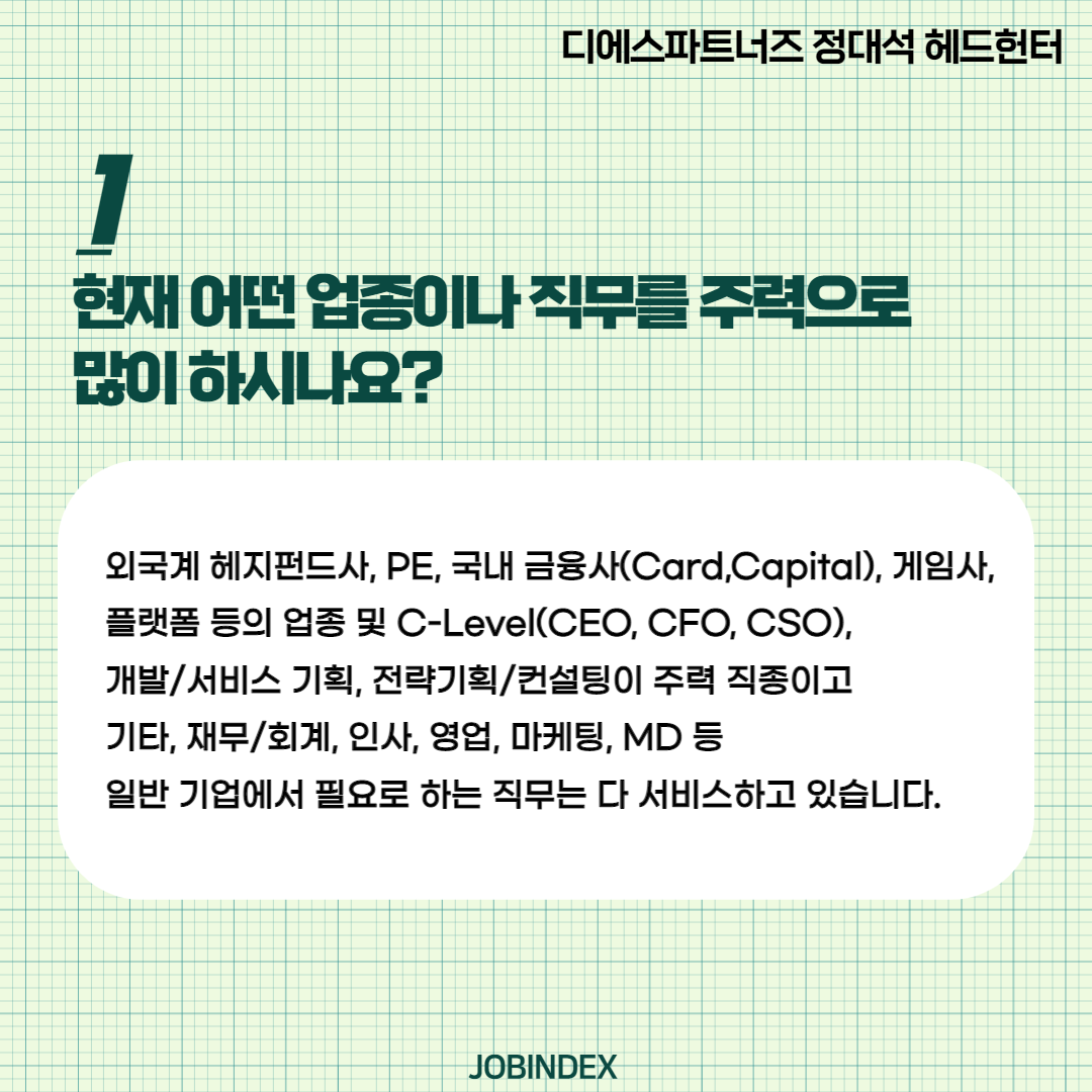 정대석 헤드헌터님은 외국계 헤지펀드사, PE, 국내 금융사(Card,Capital), 게임사, 플랫폼 등의 업종을 주력으로 맡고 있고, 또한 재무/회계, 인사, 영업, 마케팅, MD 등 일반 기업에서 필요로 하는 직무도 모두 진행하고 계십니다.