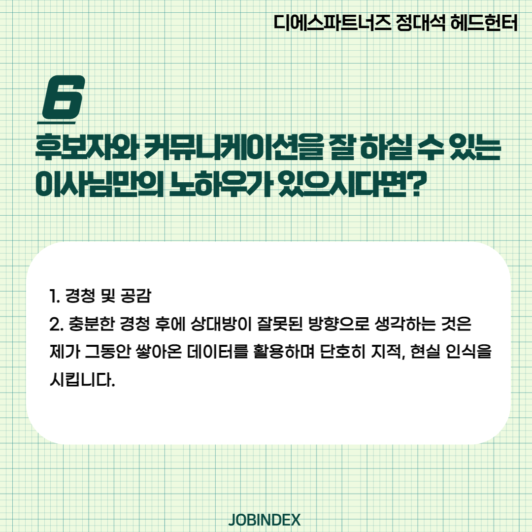 항상 후보자의 말에 경청하고 공감하며, 상대방이 잘못된 방향으로 생각하는 것은 단호히 현실 인식을 시켜주시는 정대석 헤드헌터님의 솔직담백한 이야기를 지금부터 만나보아요:)