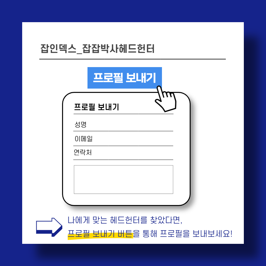 📣 잡인덱스에서 헤드헌터 찾기를 통해 나와 잘 맞는 헤드헌터를 찾고, 프로필 보내기까지 할 수 있습니다.