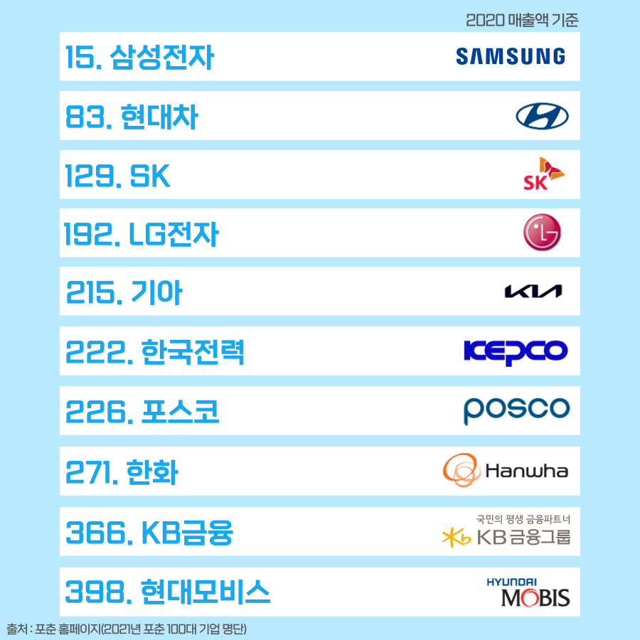 포춘이 발표한 2021 글로벌 500대 기업 순위에 따르면 우리나라는 삼성전자, 현대차, SK, LG전자, 기아차, 한국전력, 포스코 등 15개 기업이 포함되어 지난해보다 1개가 증가했는데요!