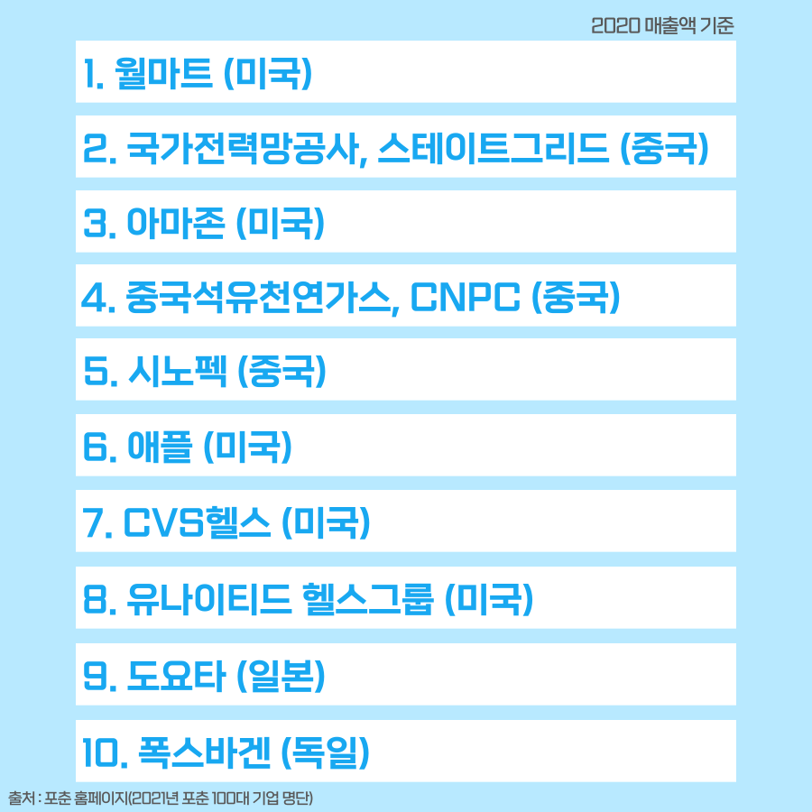 미국 경제 매거진 포춘이 2020년 회계 연도 매출액을 기준으로 글로벌 500대 기업을 선정해 발표했습니다.