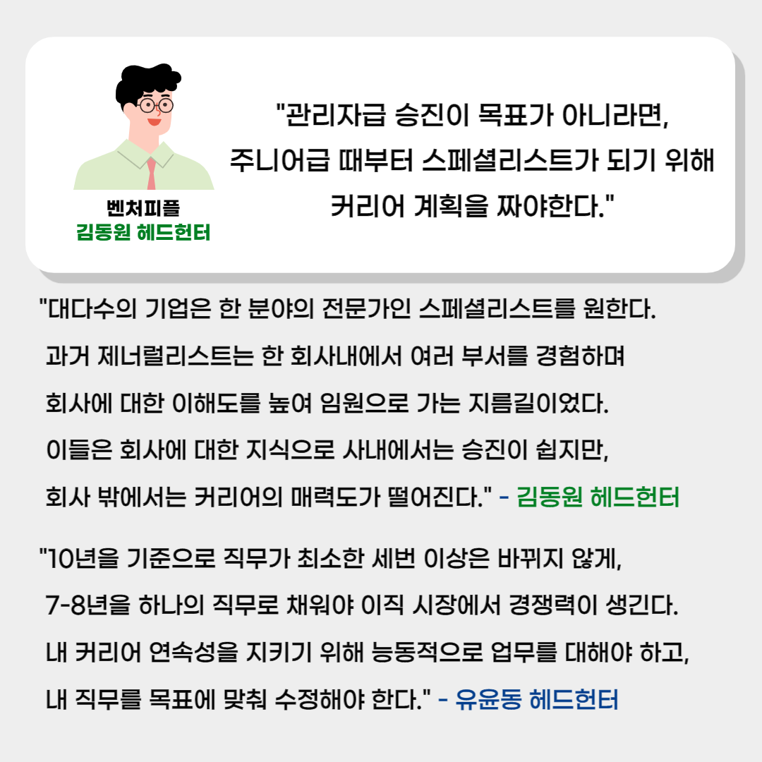 이에 대해 10년 넘게 이직 시장에서 활동하고 있는 헤드헌터 4명을 통해 직장인을 위한 커리어 관리 방법에 대해