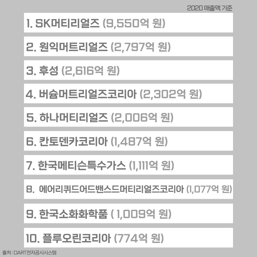 특히, 반도체 및 디스플레이용 특수가스 및 전구체 관련 기업들은 지난 3년간 꾸준한 성장을 지속해왔다고 하는데요, 국내 특수가스 공급업체들의 매출액 TOP 10 순위는 어떻게 될까요?