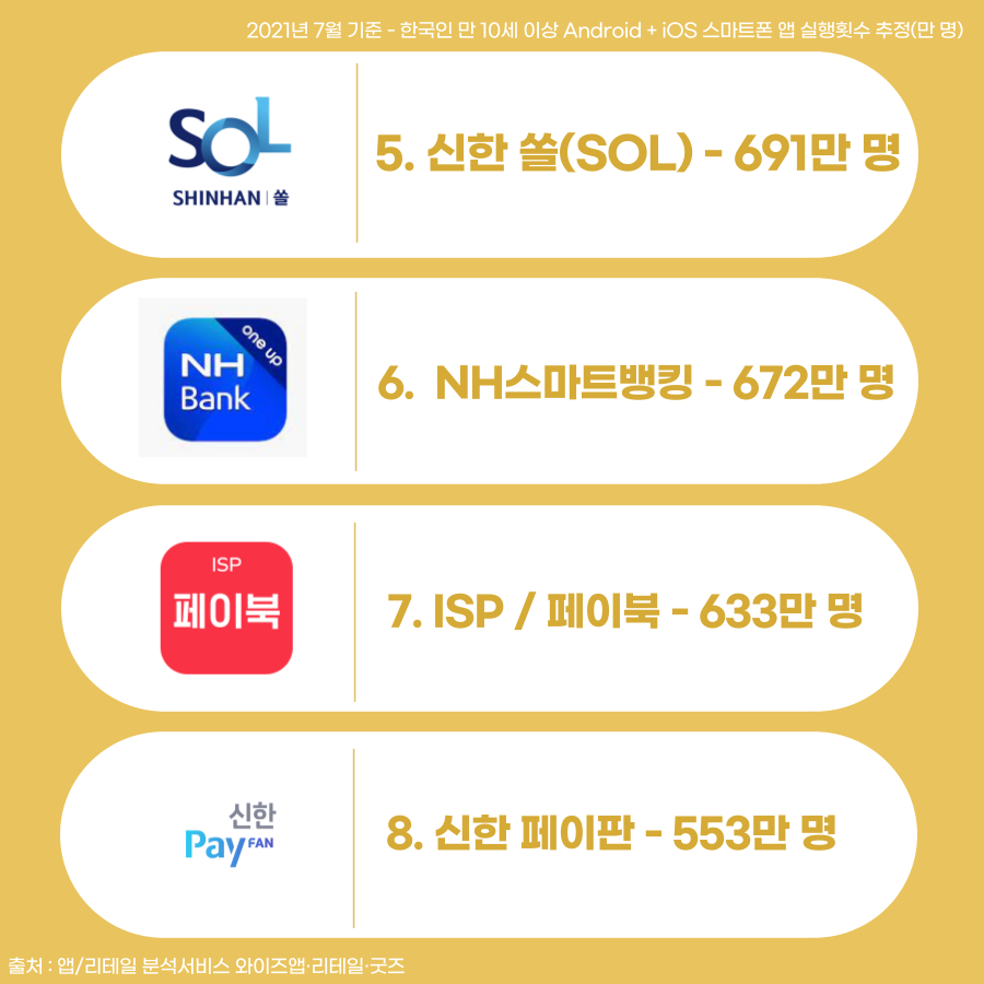 그렇다면, 한국인이 가장 많이 사용하는 금융 앱 TOP 8에는 어떤 어플들이 있을지 알아볼까요?