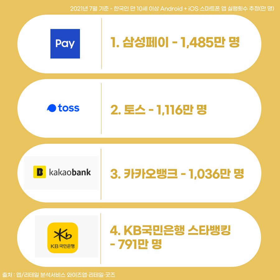 성인 한 명이 스마트폰에 설치한 결제 및 금융 관련 앱이 평균 6.84개라고 합니다.