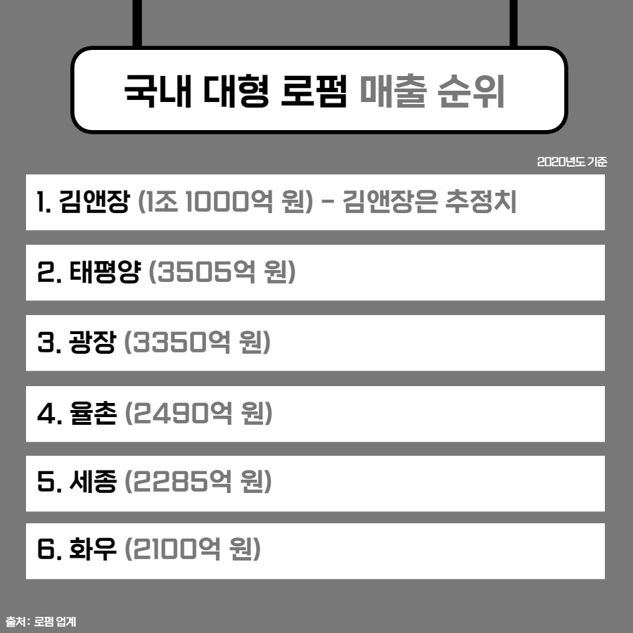 지난해 국내 6대 로펌은 총 2조 5000억 원 상당의 매출을 거두었습니다. 부동의 1위는 김앤장이었고, 태평양과 광장이 그 뒤를 이었습니다.