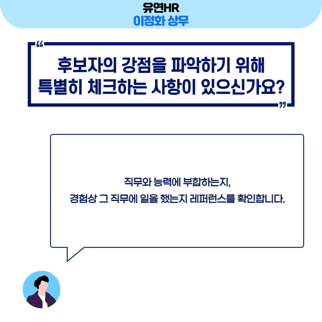 후보자와 커뮤니케이션을 잘 하기 위해 사전에 학력, 동기, 교우 등의 정보를 미리 파악해 친근감 있게 다가가고, 고객사와의 관계를 잘 형성하기 위해 JD에 충실한 인재를 추천하며 빠른 피드백을 전달하시는 이정화 헤드헌터님을 지금부터 만나볼까요?