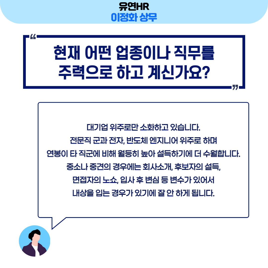 이정화 헤드헌터님은 전문직 군과 반도체 엔지니어 등 대기업 위주로의 프로젝트만 진행하고 계십니다.