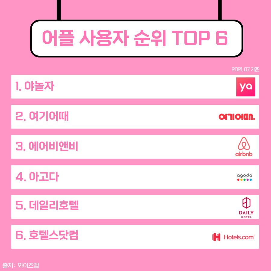 다양한 숙박 어플 중에서 많은 사람들이 이용하는 어플은 무엇일까요? 그래서 이번에 준비한 주제는 국내 숙박 어플 사용자 순위 TOP 6입니다.