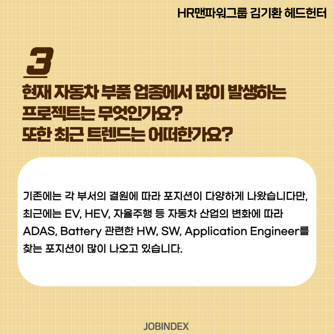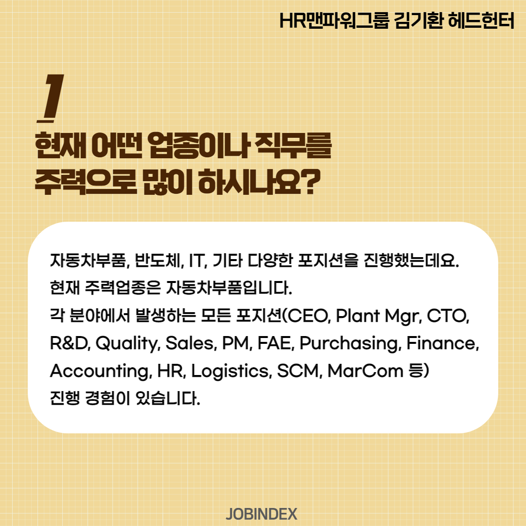 HR맨파워그룹 김기환 이사님은 전기전자, 자동차 부품사 및 연료전지 관련회사 Engineer, Sales, PM 경력을 통해 현재 자동차부품, 반도체, IT, 기타 등 다양한 포지션을 진행하고 계십니다.