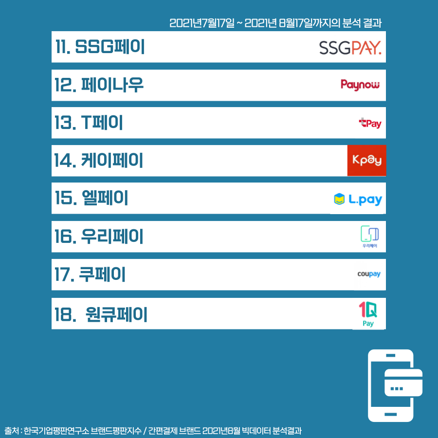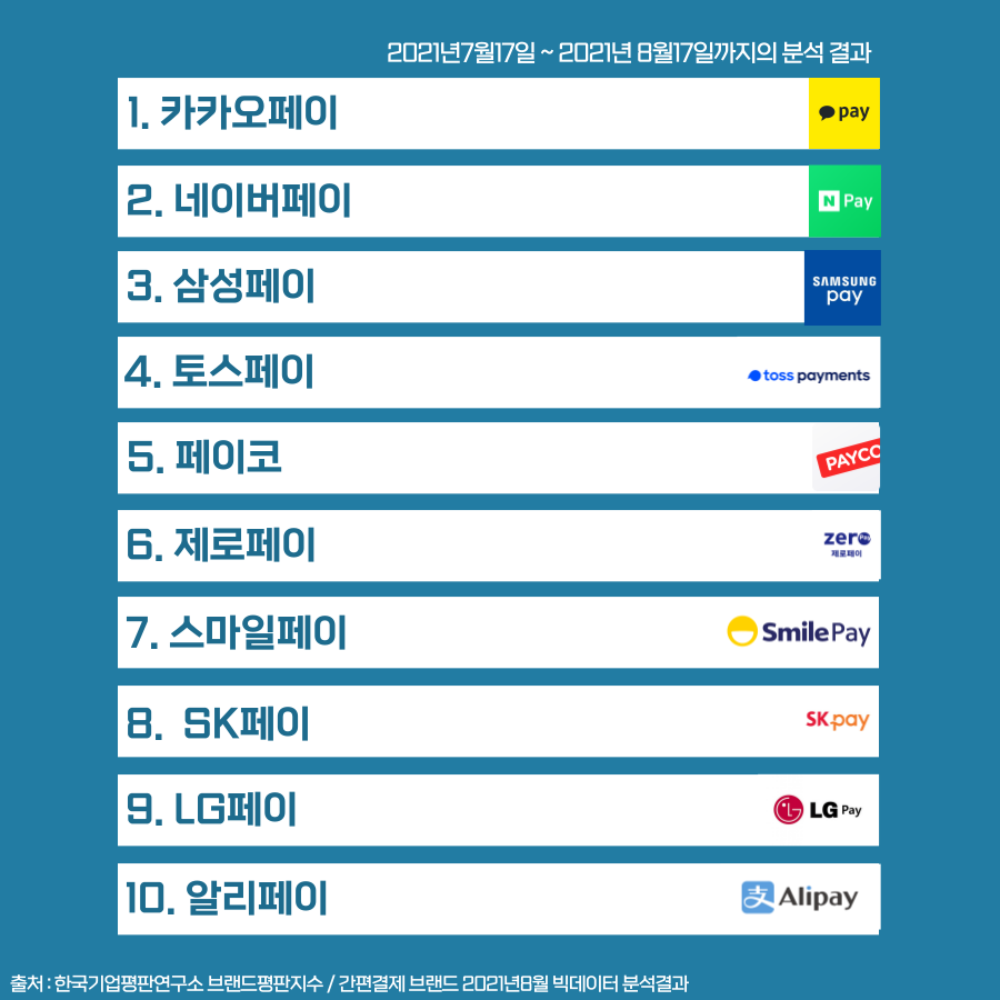 또한, 페이 서비스는 한 번이라도 결제 서비스를 이용한 고객들이 다음번에도 같은 서비스를 이용할 확률이 높기 때문에 브랜드 평판이 중요할 것 같은데요, 그래서 이번에 준비한 주제는 국내 간편결제 서비스 브랜드 평판 TOP 18입니다!