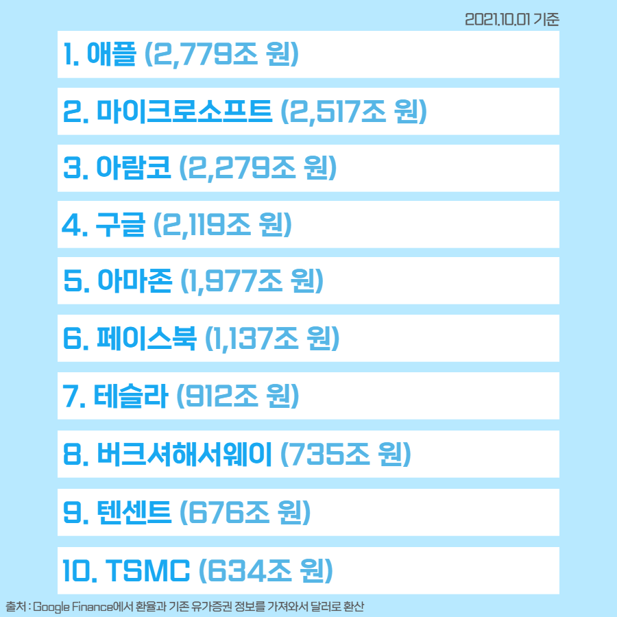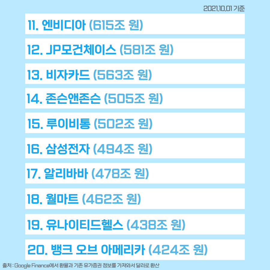 시가총액은 기업의 가치를 평가하는 지표로 활용되는데요, 전 세계 기업 중 📈시가총액이 TOP 20📈에는 어떤 기업이 속하는지 알아볼까요?