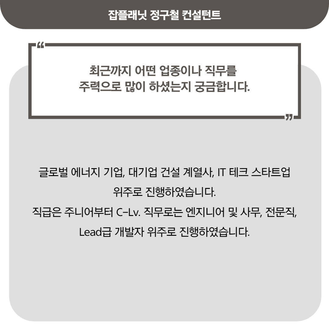 잡플래닛 정구철 컨설턴트님은 글로벌 에너지 기업, 대기업 건설 계열사, IT Tech 스타트업 분야에서 주력으로 활동하시며, 직급은 주니어부터 C-Level. 직무로는 엔지니어 및 사무, 전문직, Lead 급 개발자 위주로 진행하십니다.
