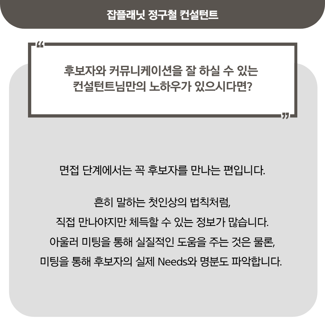 고객사가 채용에 있어 어려움을 겪을 때 적기에 적합한 인재를 추천하고, 후보자에겐 무리한 설득보다는 최대한 객관적인 정보를 제공하여 의사 결정에 도움을 드리는 정구철 컨설턴트님의 인터뷰를 지금부터 만나볼까요?