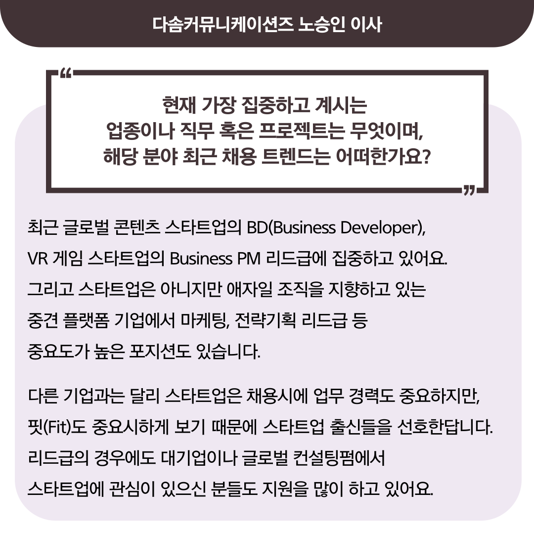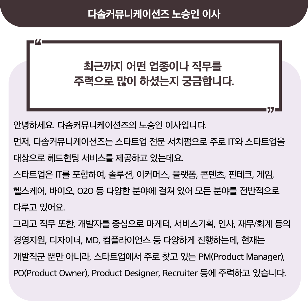 다솜커뮤니케이션즈 노승인 이사님은 스타트업을 전문 분야로 담당하고 계시며, 스타트업은 IT를 포함하여, 솔루션, 이커머스, 플랫폼, 콘텐츠, 핀테크, 게임, 헬스케어, 바이오, O2O 등 다양한 분야를 전반적으로 다루십니다. 최근에는 스타트업에서 주로 찾고 있는 PM, PO, Product Designer, Recruiter 등 직무에 주력하고 계십니다.