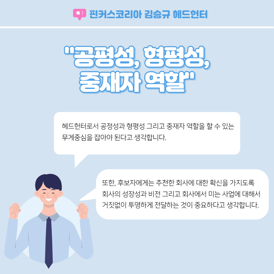 HR컨설팅 박현정 헤드헌터, KS컨설팅/피플뱅크코리아 강혁민 헤드헌터, 핀커스코리아 김승규 헤드헌터의 인터뷰를 들여다볼까요?