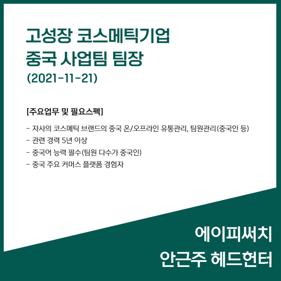 📢 [고성장 코스메틱 기업] 중국 사업팀 팀장 (2021-11-21)