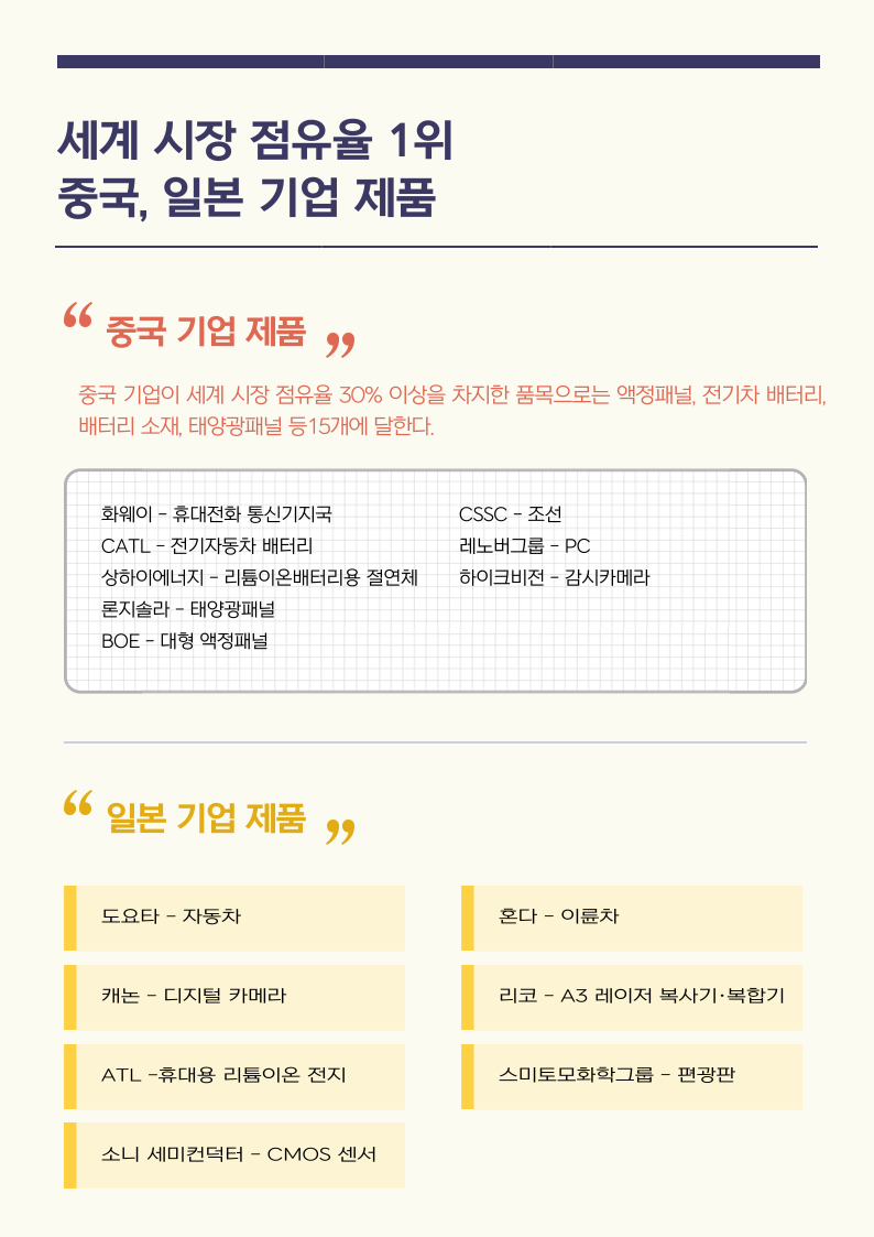 구체적으로 세계 시장 점유율 1위인 주요 한국 제품과 더불어 중국, 일본 기업 제품에 무엇이 있는지 알아볼까요?