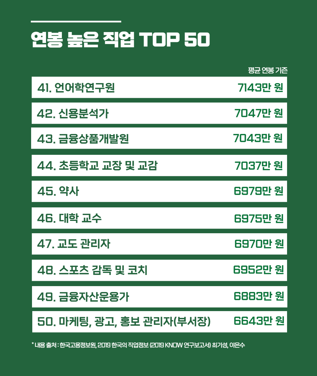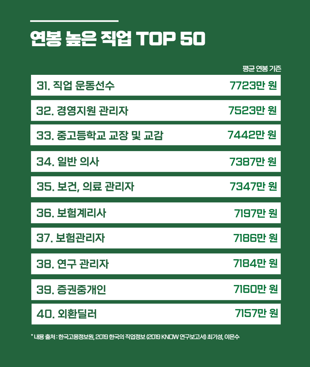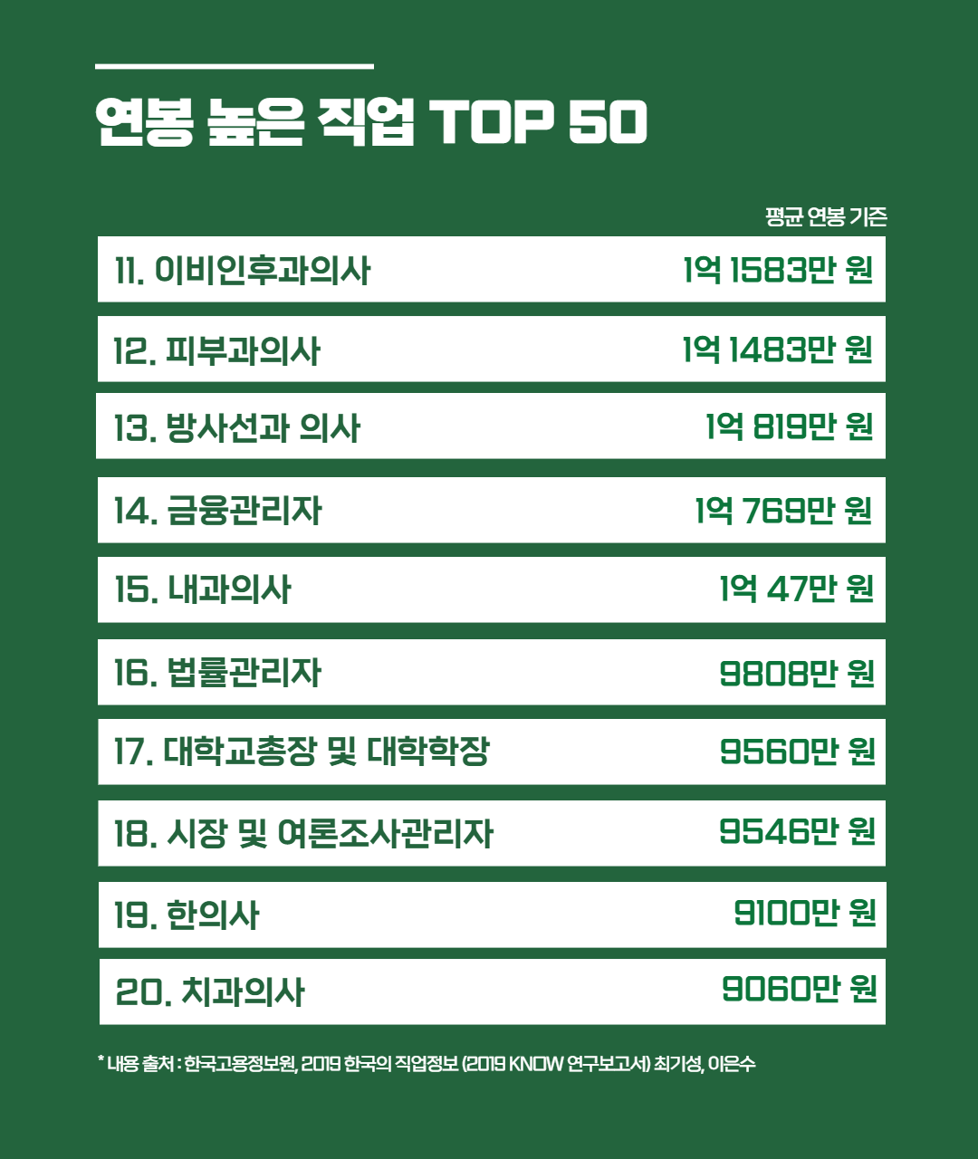 오늘은 한국고용정보원 '2019 한국의 직업정보'를 바탕으로 연봉 높은 직업 TOP 50 순위를 준비해 봤는데요, 고용시장에 흐름에 따라 연봉은 언제든지 바뀔 수 있는 부분이니 "이런 직업이 연봉이 높구나~" 하고 참고해 주시면 감사하겠습니다. :)