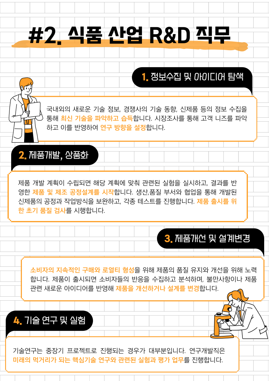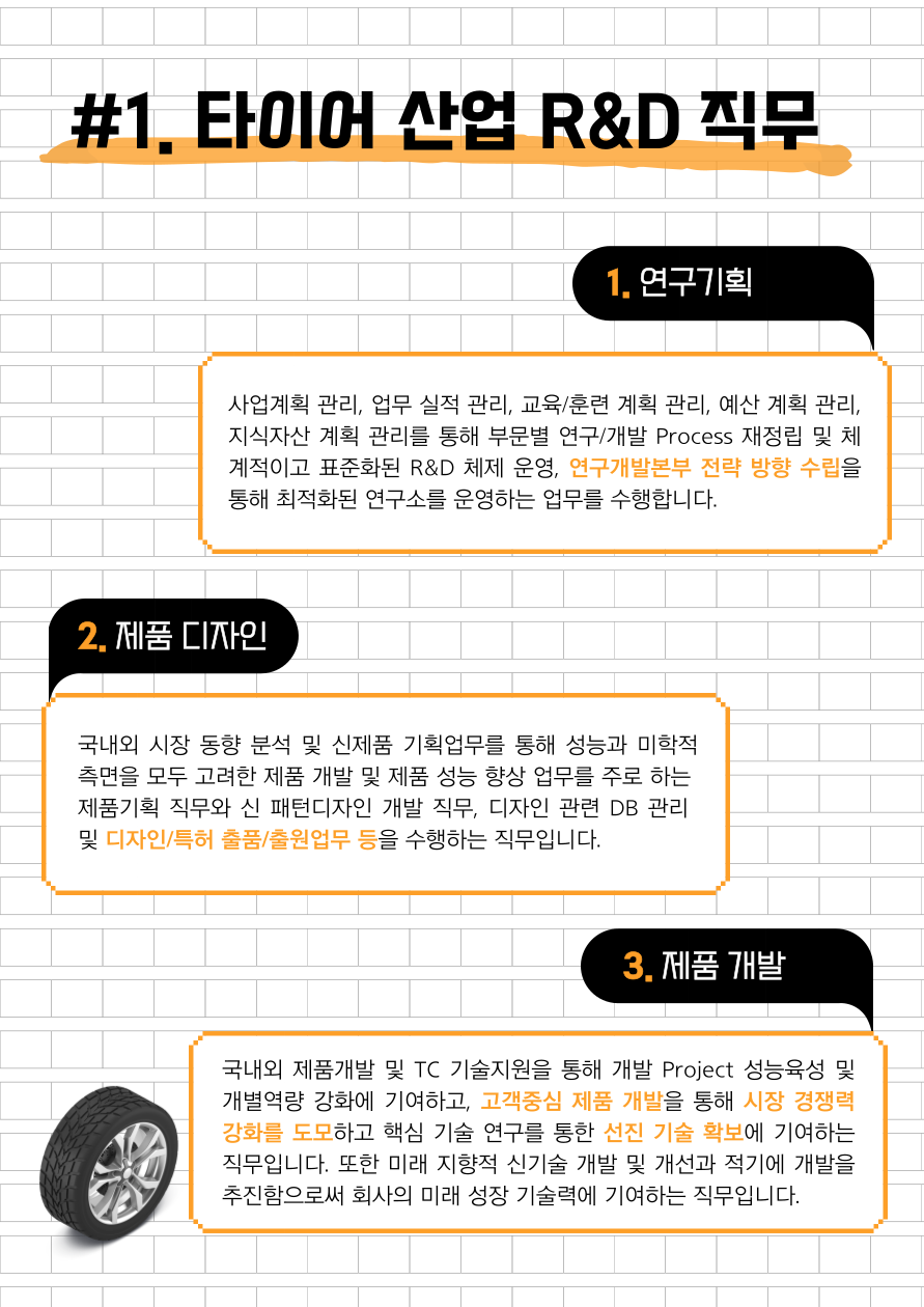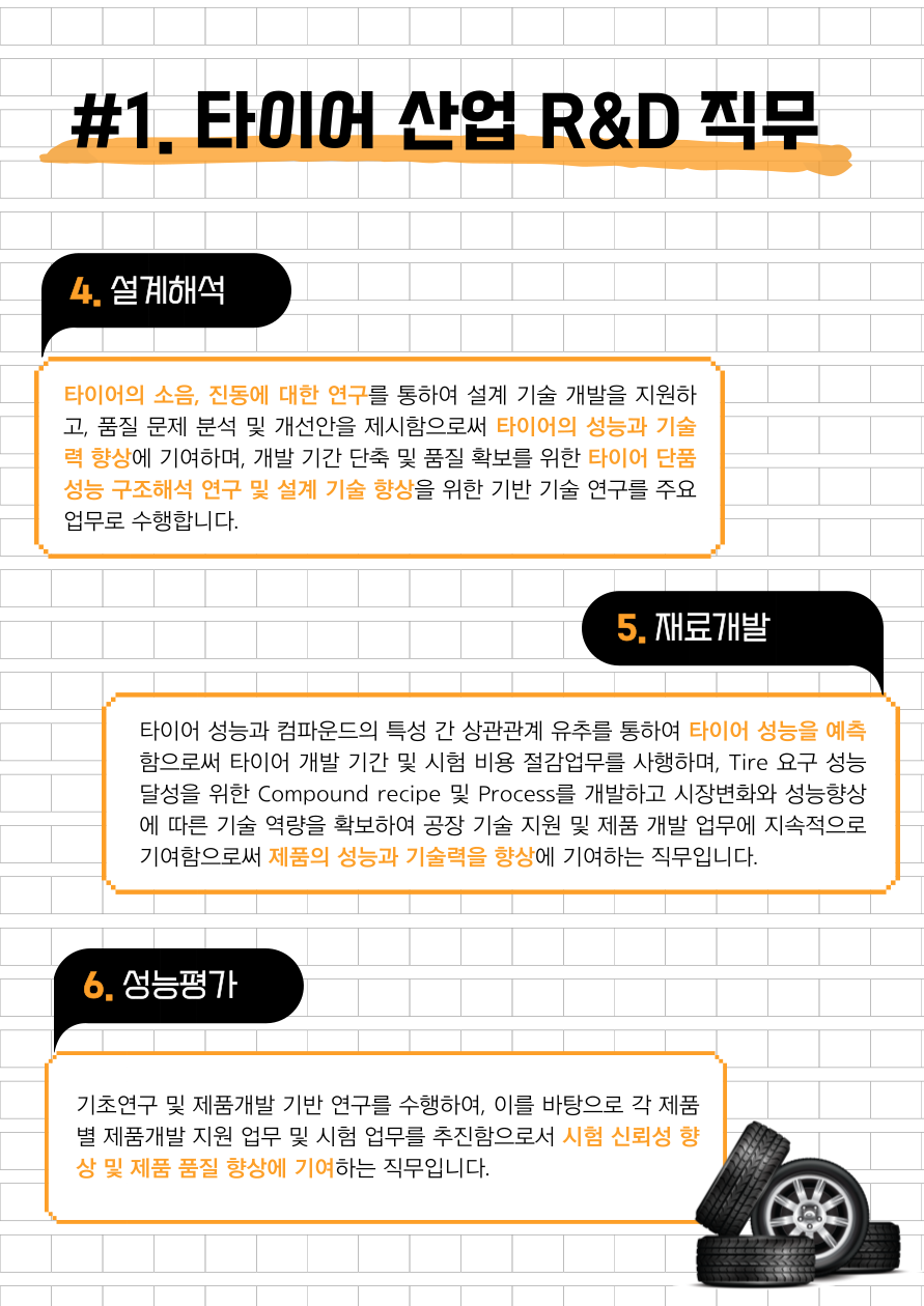 오늘은 준비한 주제는 직무소개로 연구개발(R&D) 직무를 산업별(타이어 / 식품 / 반도체)로 자세히 알아보는 시간을 가지도록 하겠습니다!