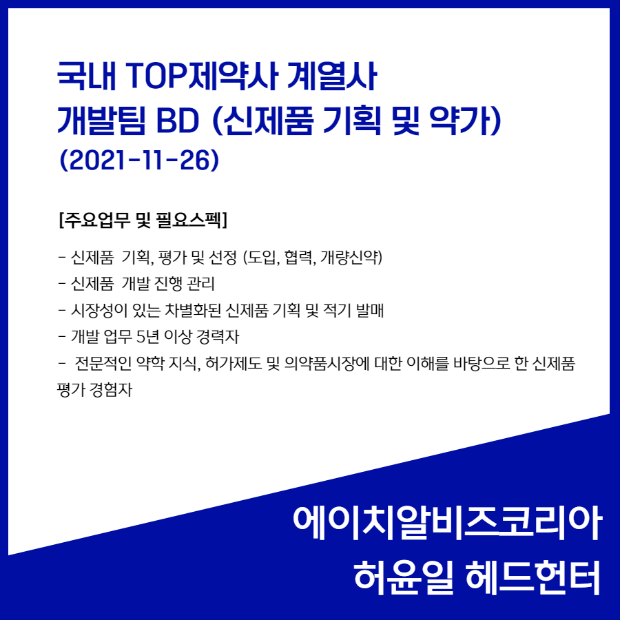 📢 [국내TOP제약사 계열사] 개발팀 BD (신제품 기획 및 약가) (2021-11-26)