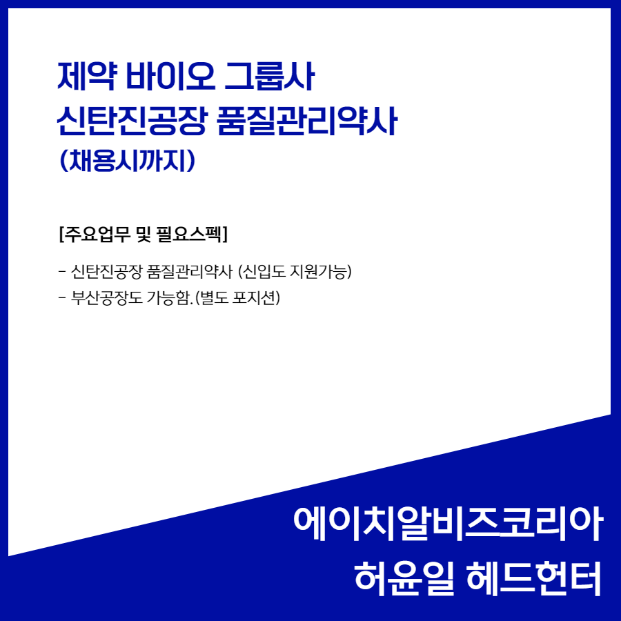 채용을 진행 중인 헤드헌터분들은 에이치알비즈코리아 허윤일 헤드헌터 / 에이피써치 안근주 헤드헌터입니다.