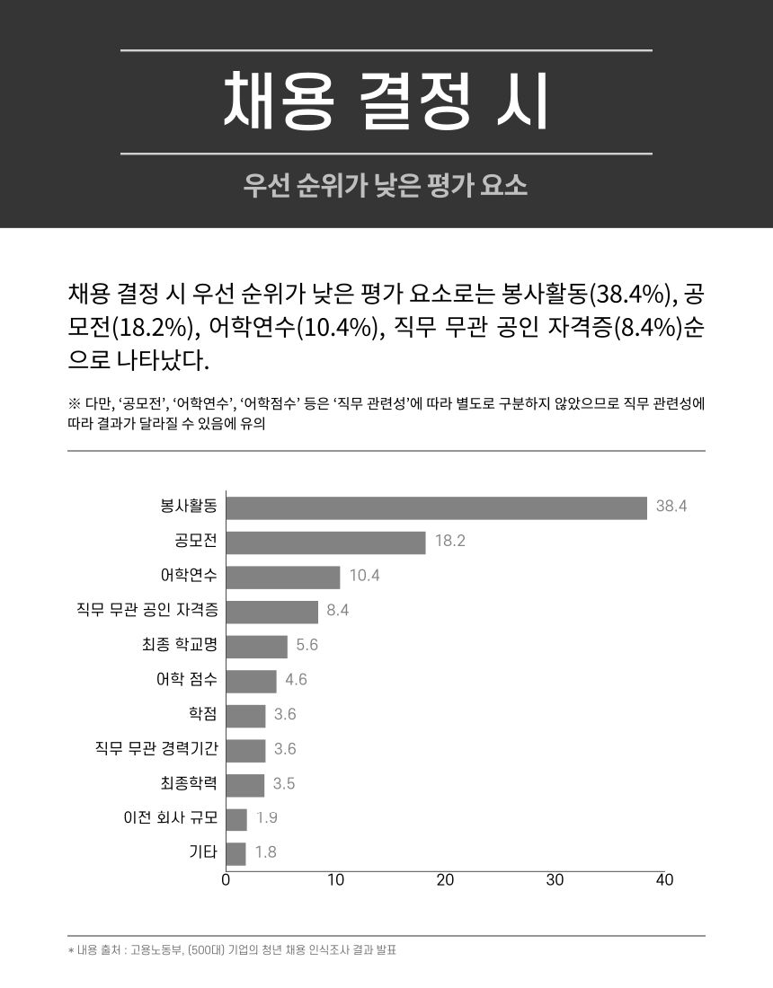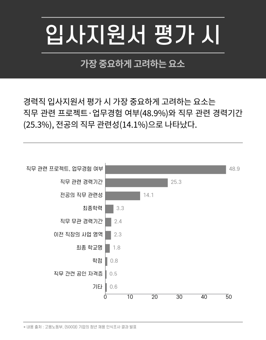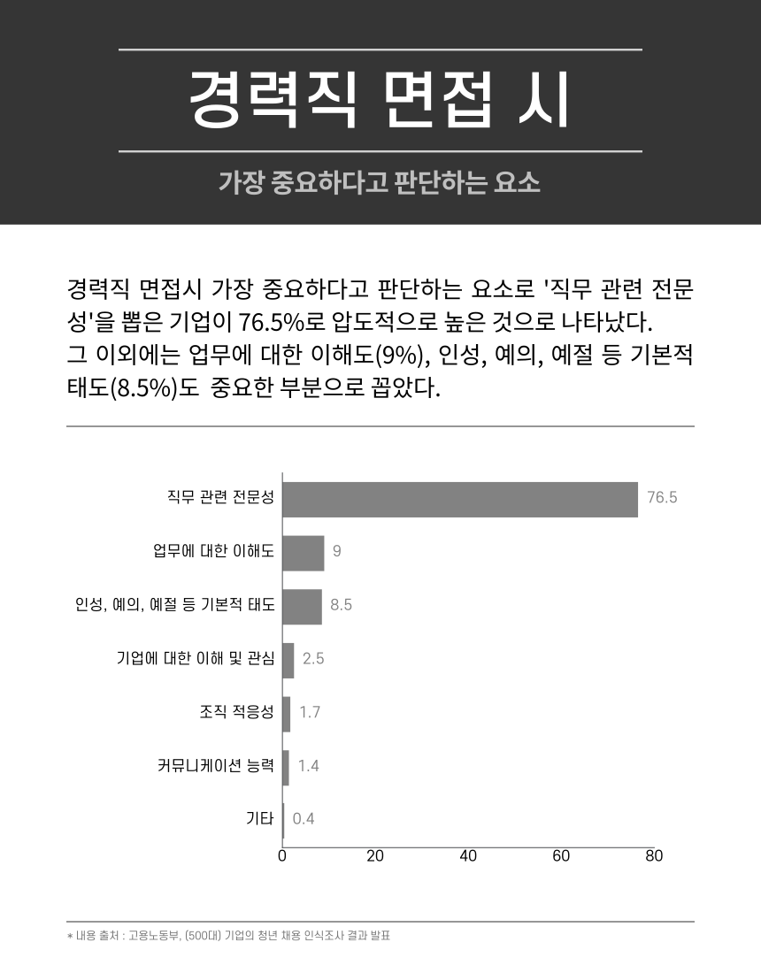 경력직 채용시 입사지원서, 면접에서 가장 중요한 요소는? 6,308 2 2 고용노동부와 한국고용정보원은 매출액 상위 500대 기업을 대상으로 진행한 청년 채용 인식조사 결과를 발표했습니다. 이번 조사에서 경력직 채용 시 입사지원서와 면접에서 가장 중요한 요소와 채용 결정 시 우선순위가 낮은 평가 요소도 조사하였는데요, 과연 어떤 요소가 중요한지 알아볼까요? 고용 시장 정보는 Jobindex 🔎 함께 보면 좋은 정보! 👀 `21.11.26 다음글포브스 선정 일하기 좋은 회사 TOP 20 이전글[JOBINDEX] : 오늘의 IT업계 핫이슈(21.11.26)