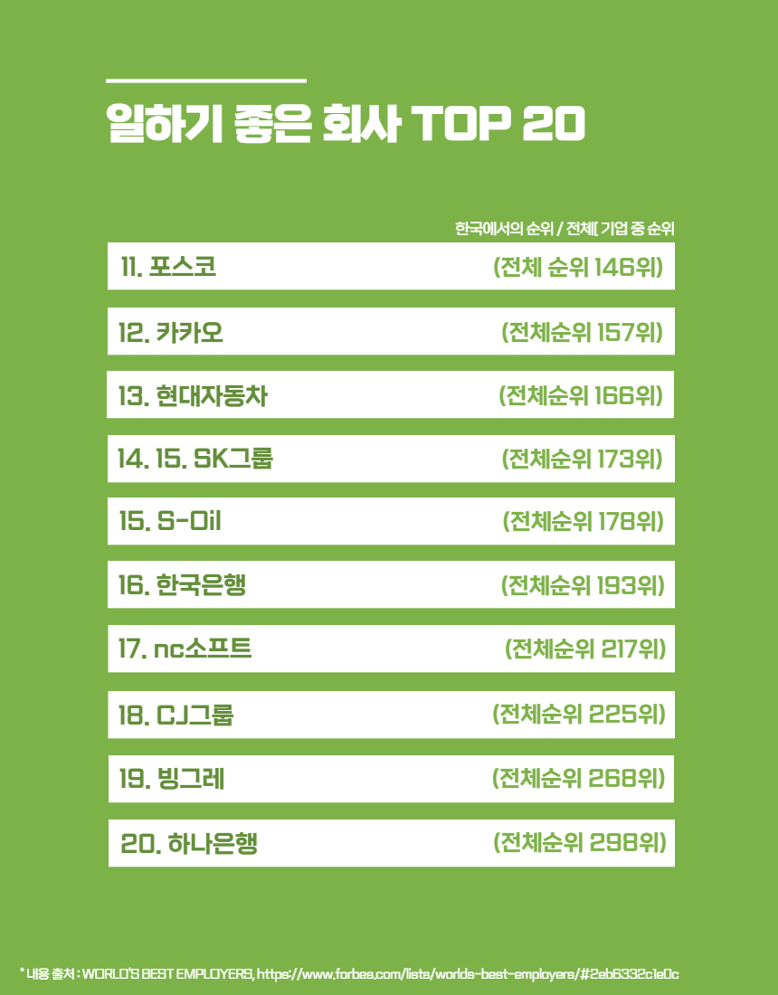 지난 10월 12일 포브스에서는 2021 세계에서 일하기 좋은 회사(WORLD'S BEST EMPLOYERS)를 선정했습니다.