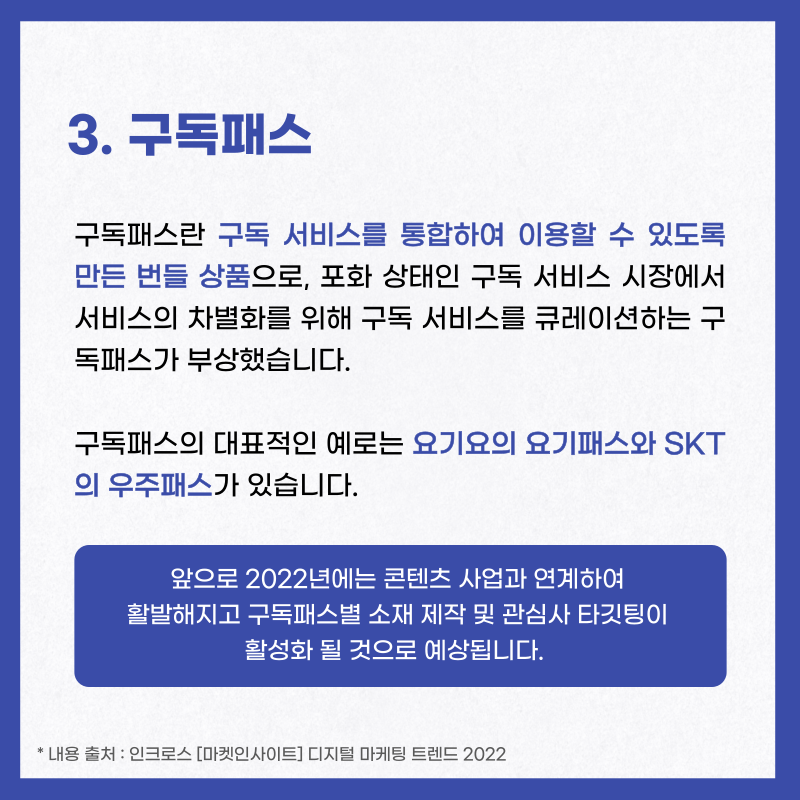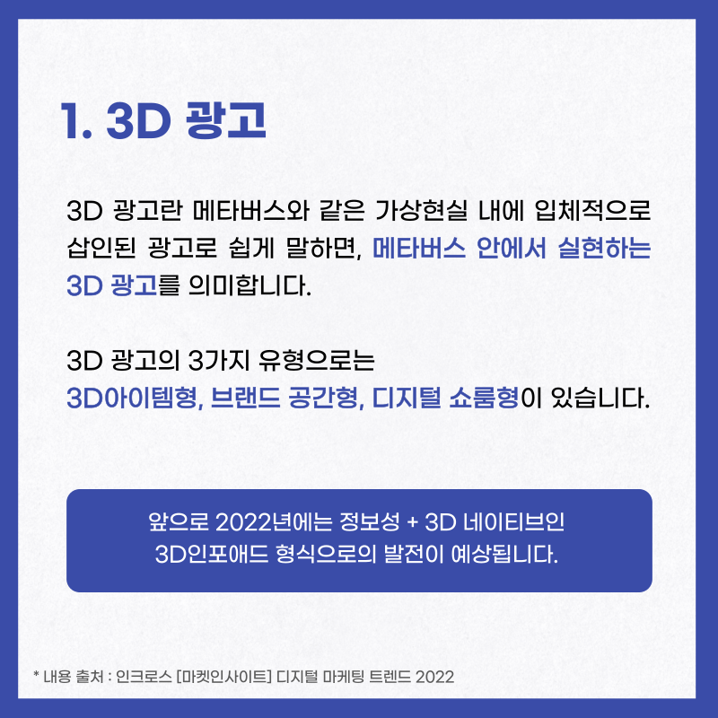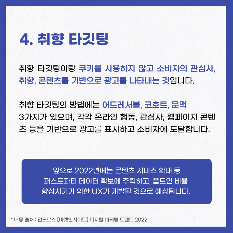 인크로스에서는 마켓인사이트를 통해 온라인 광고 시장의 최근 이슈 및 미디어나 소비자에 대한 데이터 분석 리포트를 발행하고 있는데요, 최근에 📋디지털 마케팅 트렌드 2022 리포트를 발표했습니다!