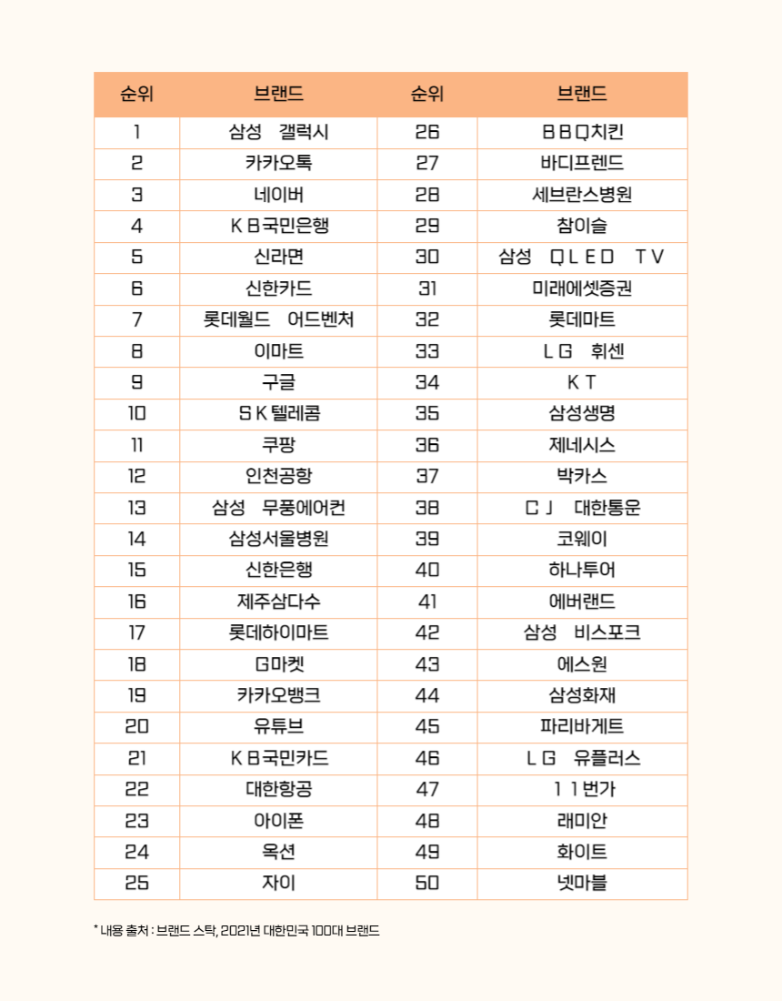 * 내용 출처 : 브랜드 스탁, 2021년 대한민국 100대 브랜드