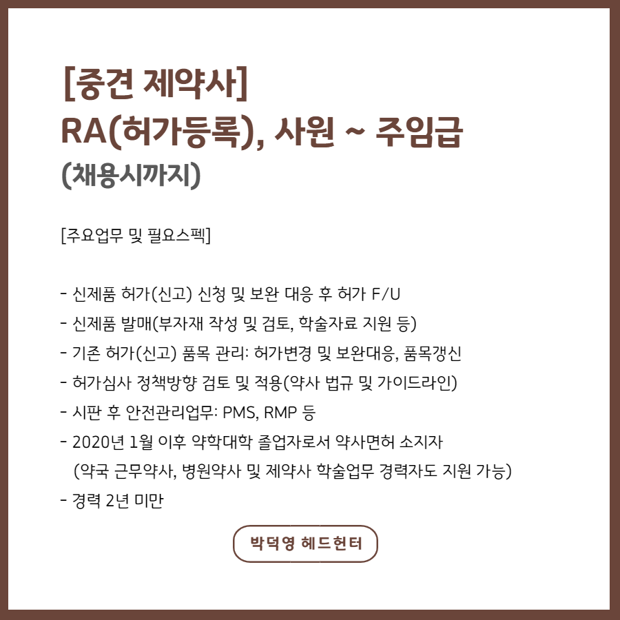 📢 [중견 제약사] RA(허가등록), 사원 ~ 주임급 - 채용시까지