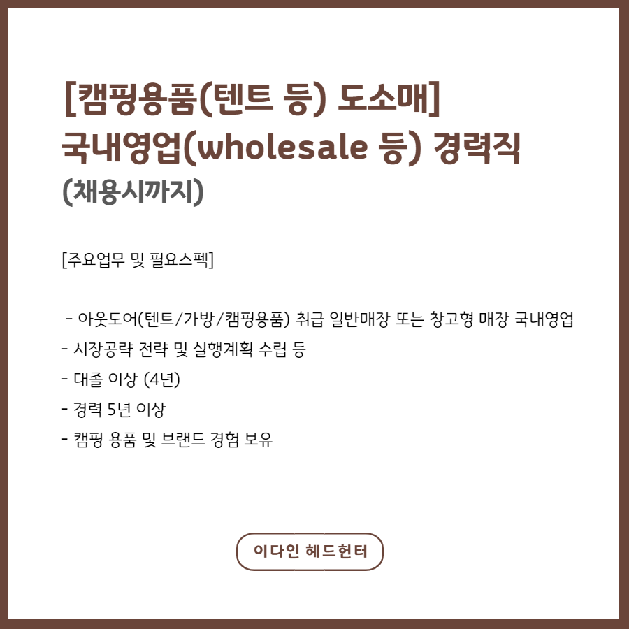 📢 [캠핑용품(텐트 등) 도소매] 국내영업(wholesale 등) 경력직 - 채용시까지