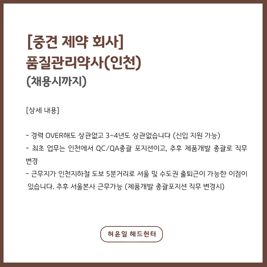 📢 [중견 제약 회사] 품질관리약사 (인천) -채용시까지