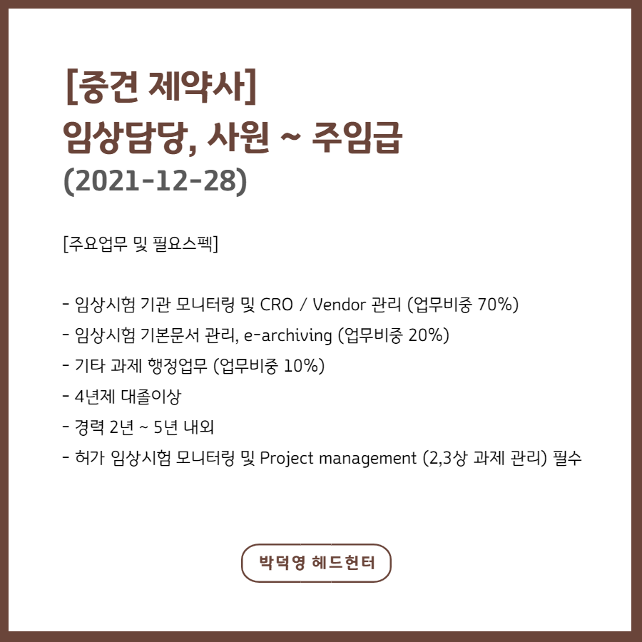 📢 [중견 제약사] 임상담당, 사원 ~ 주임급 - 2021-12-28까지