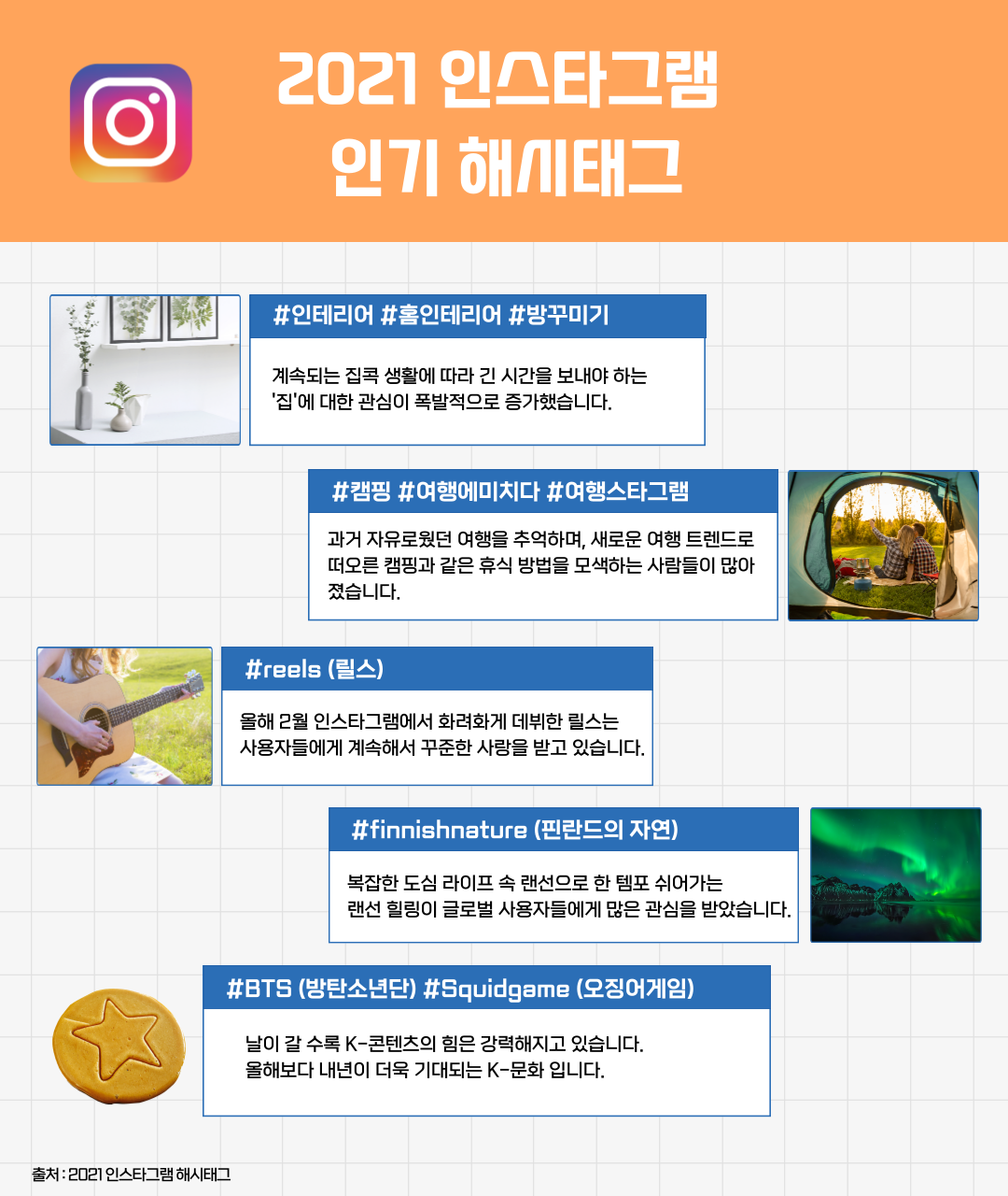 인스타그램과 트위터는 주된 SNS 활동처로서 사람들의 일상과 실시간 핫이슈에 민감하게 반응하는 플랫폼입니다. 2021년 인스타그램과 트위터에서 국내를 뜨겁게 달궜던 키워드는 무엇이었을지 알아볼까요?