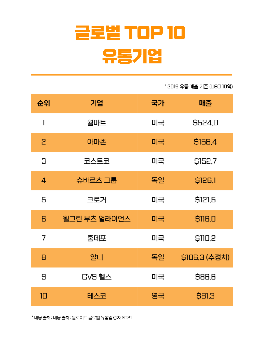 딜로이트에서 발표한 글로벌 유통업 강자 2021 보고서에 따르면, 전 세계 Top 250 유통 기업은 팬데믹에도 불구하고 2019 회계연도 총 4조 8,500억 달러의 매출을 올렸으며, 연평균 성장률 5.0%을 보이고 있다고 합니다.