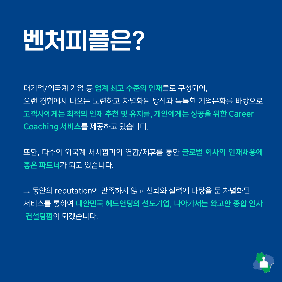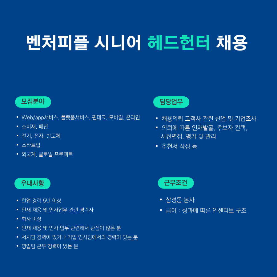 서치펌 벤처피플에서 시니어 컨설턴트를 채용한다고 합니다. 벤처피플 회사 소개와 채용공고를 보시고 관심이 있다면 지원해보시는 게 어떨까요?