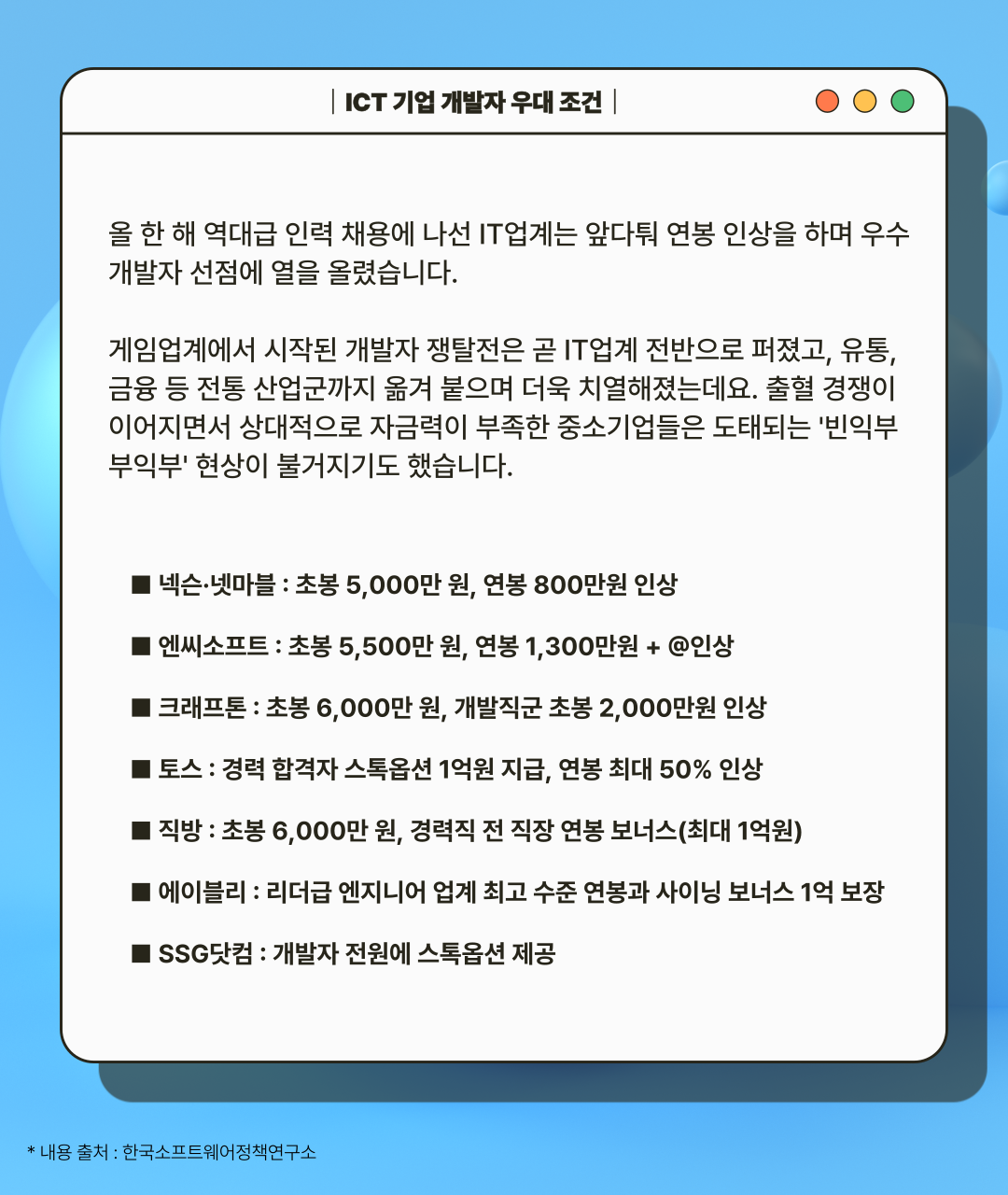 게임업계에서 시작된 개발자 쟁탈전이 IT업계 전반으로 퍼져 우수 개발자 채용에 열을 가하는 상황입니다.