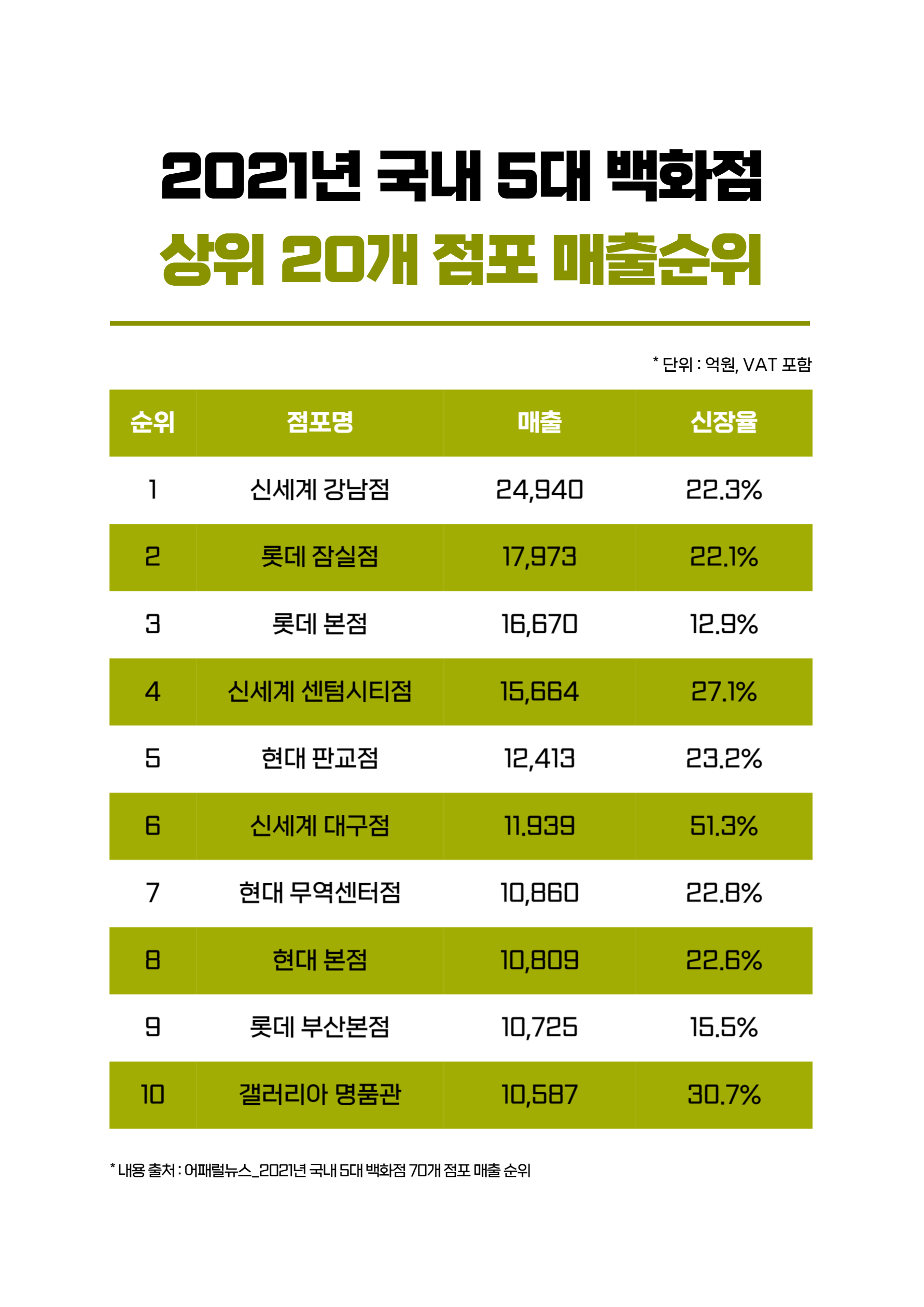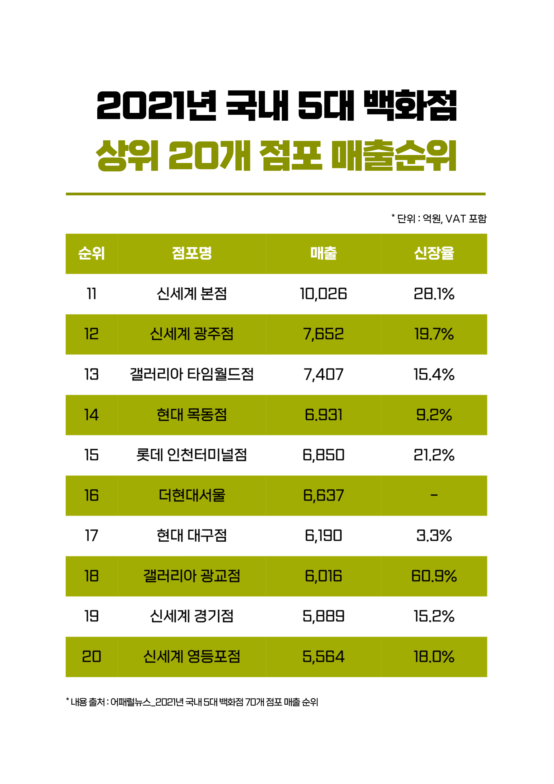 그렇다면 2021년 국내 5대 백화점(신세계,롯데,현대,갤러리아,AK) 상위 20개 점포 매출순위는 어떻게 될까요?