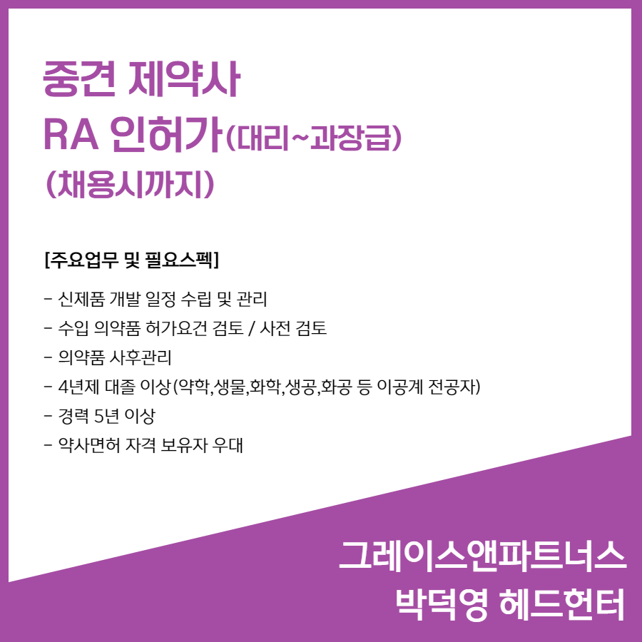 📣 [중견 제약사] - RA인허가 (대리 ~ 과장급)