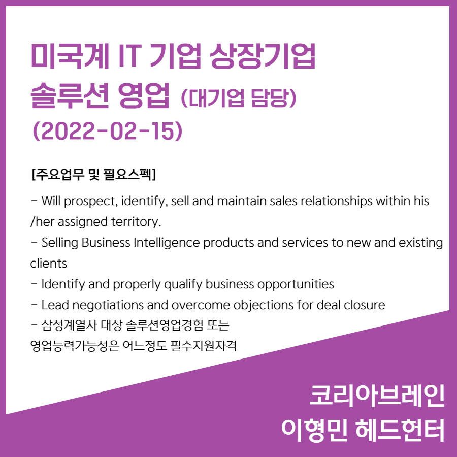📣 [미국계 IT 기업 상장기업] - IT솔루션 영업(대기업 담당)