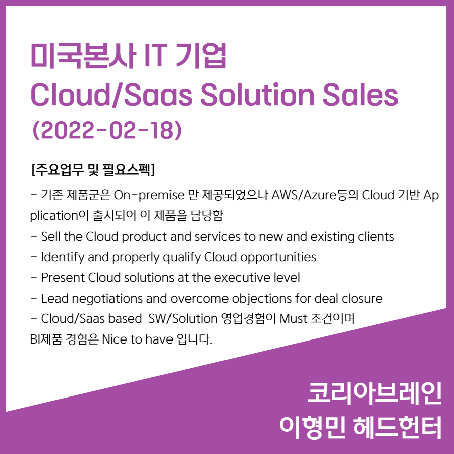 📣 [미국본사 IT 기업] - IT Cloud/Saas Solution Sales