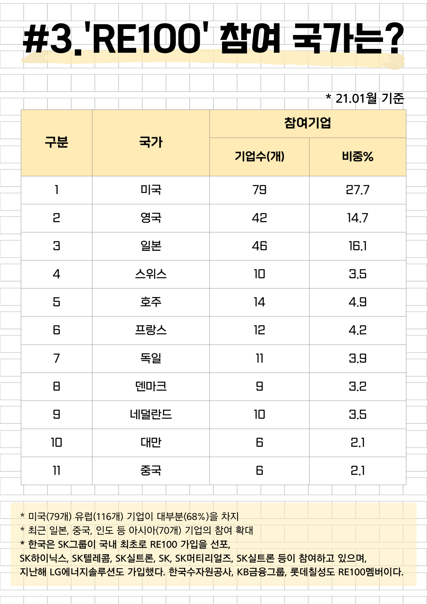 그래서 오늘은 RE100에 참여한 글로벌 국가 및 기업들은 어느곳이며, 캠페인의 목적, 참여대상, 참여배경까지! 알려드리려고 합니다:) 같이 보실까요?👀👇