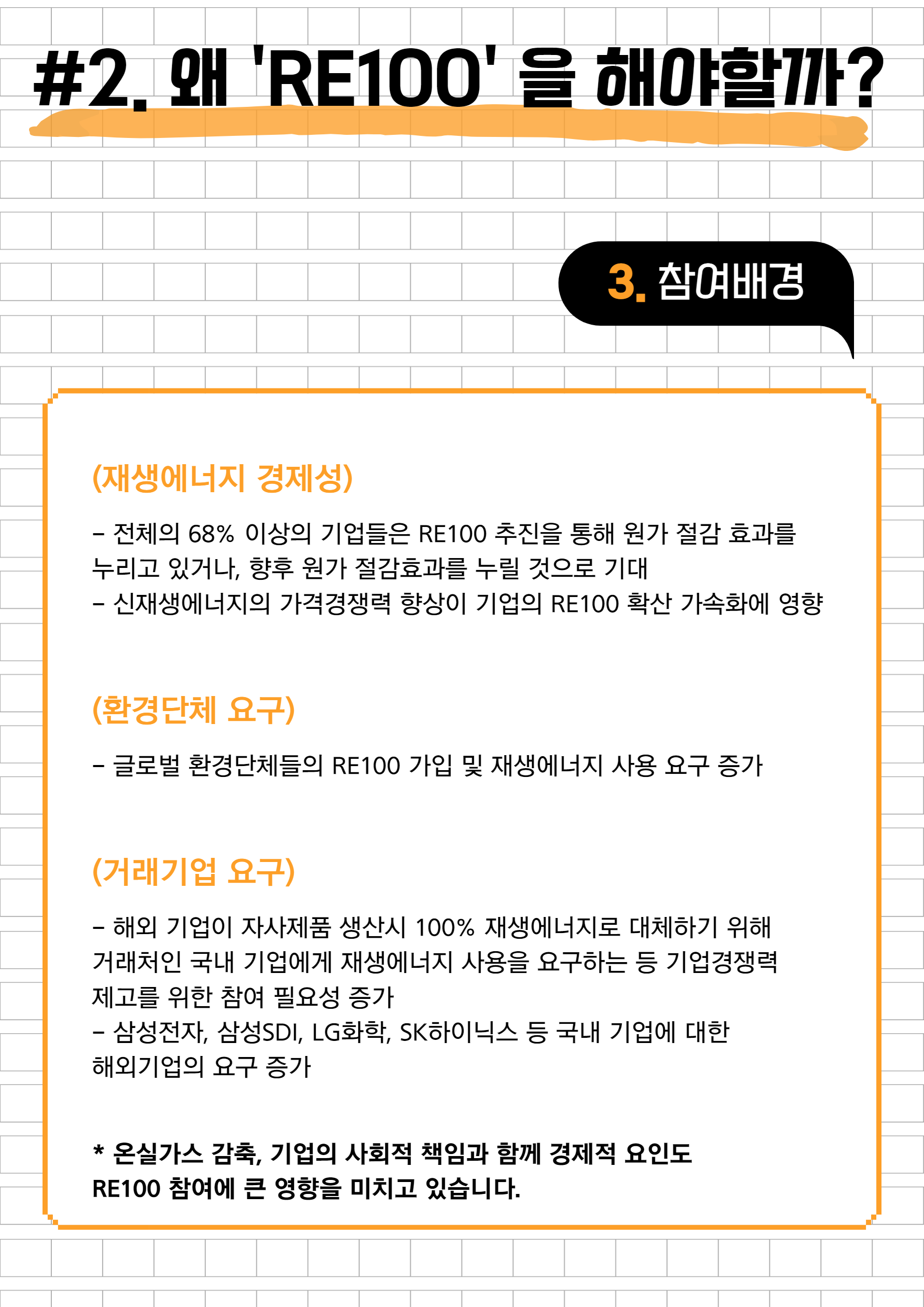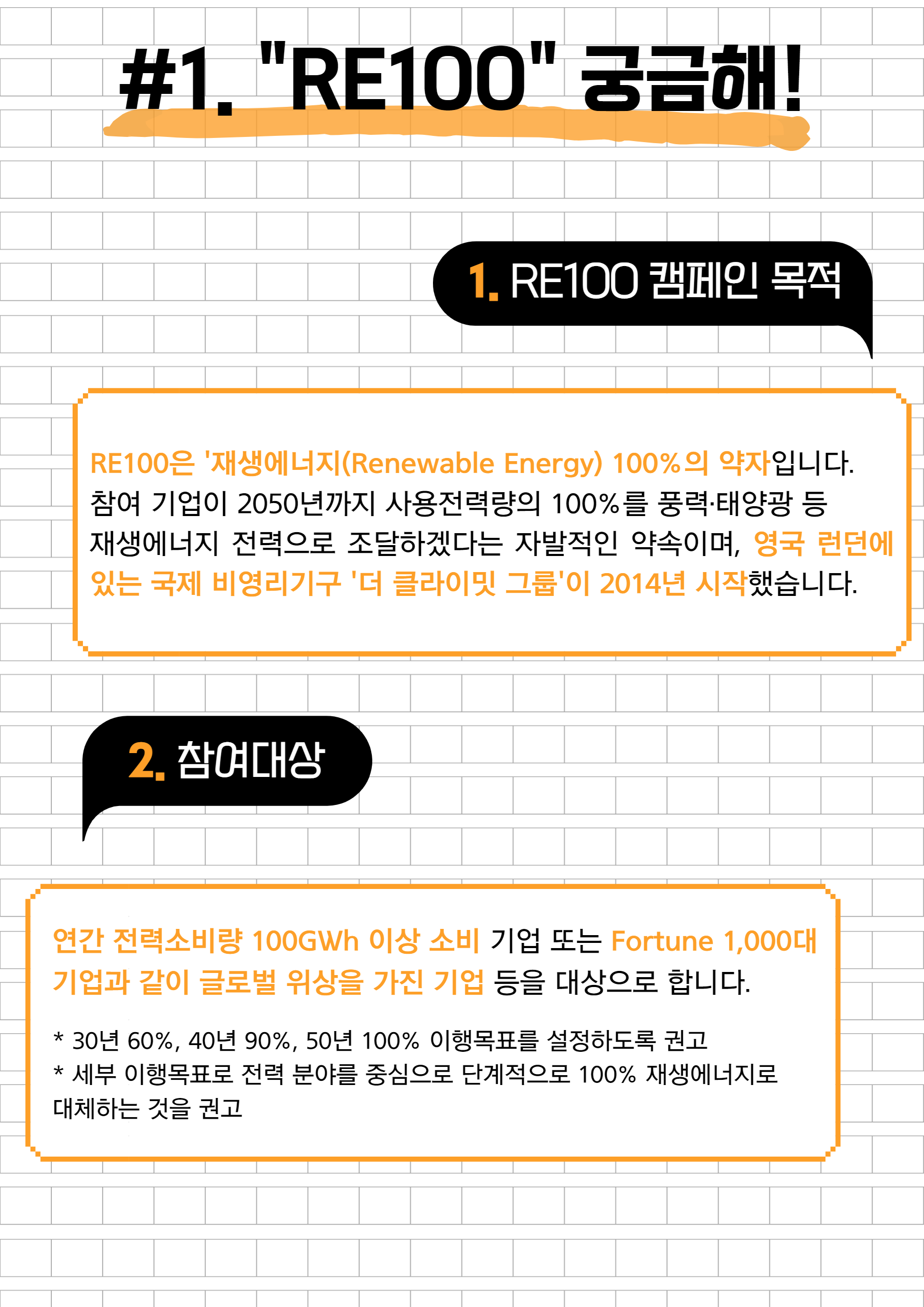 RE100은 기업의 사용전력 100%를 2050년까지 태양광, 풍력 등 재생에너지로 사용하겠다고 선언하는 캠페인으로, 구글 등 글로벌 기업들이 국내 협력사에도 재생에너지 사용을 요구함에 따라 국내 기업에도 직접적으로 영향을 미치게 됐습니다.