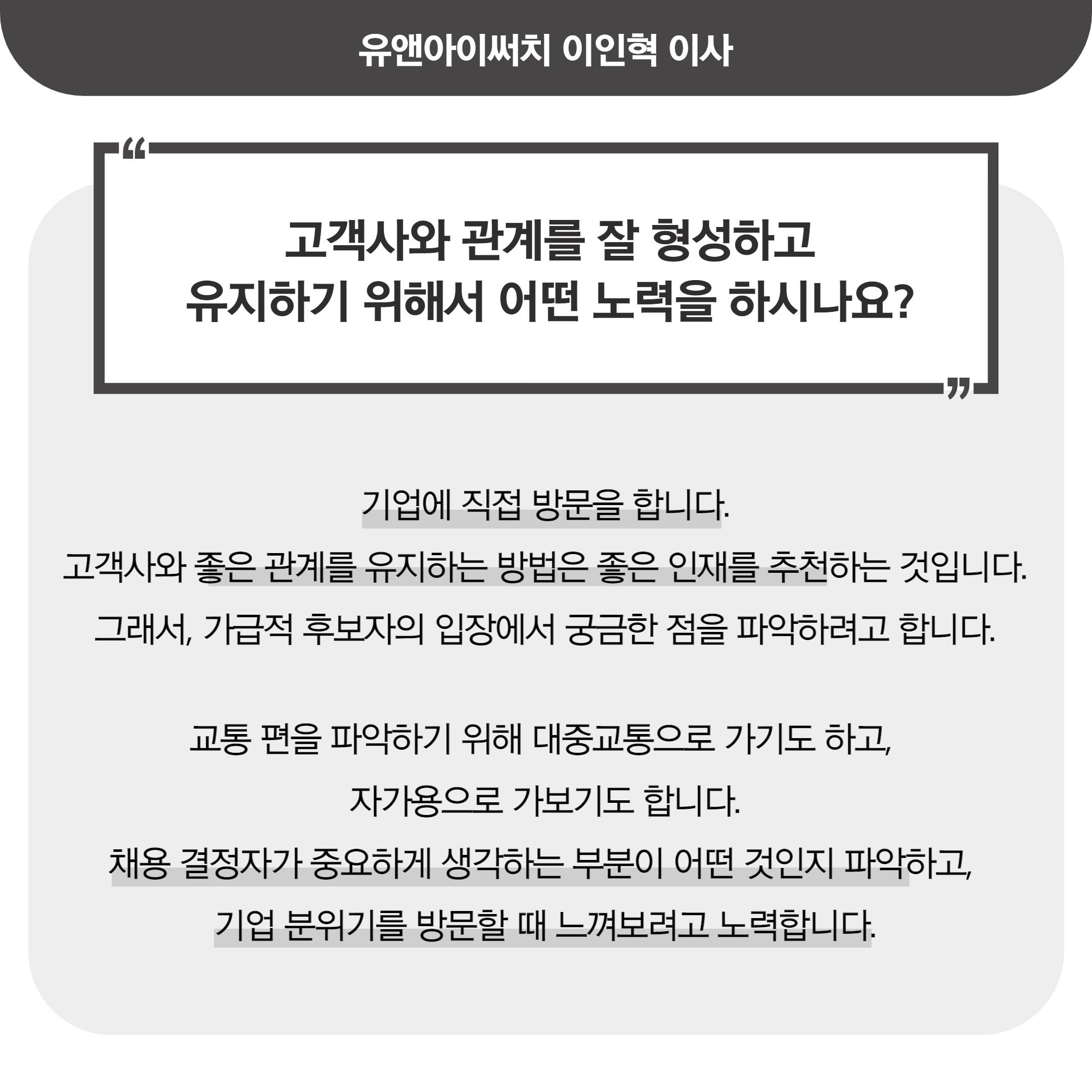 고객사와 좋은 관계를 유지하기 위해 적합한 인재를 신속하게 추천하고, 후보자의 입장에서 궁금한 점을 파악하기 위해 직접 발로 뛰어다니며 항상 고민하시는 이인혁 이사님의 인터뷰를 지금부터 만나봅시다:)