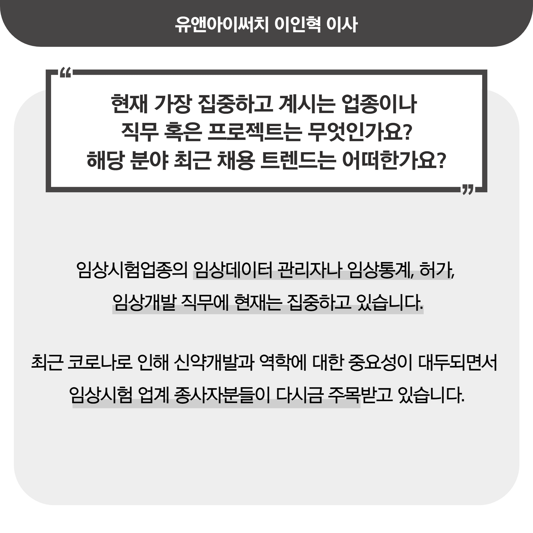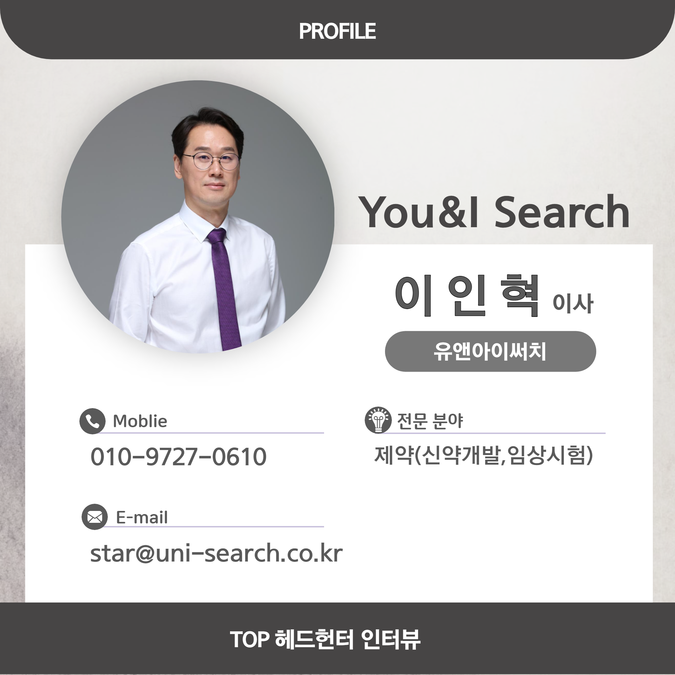 이인혁 이사님은 제약 담당 헤드헌터이며, 전문분야로는 신약개발 분야의 업계 종사자분들을 주력으로 헤드헌팅 하고 있습니다.