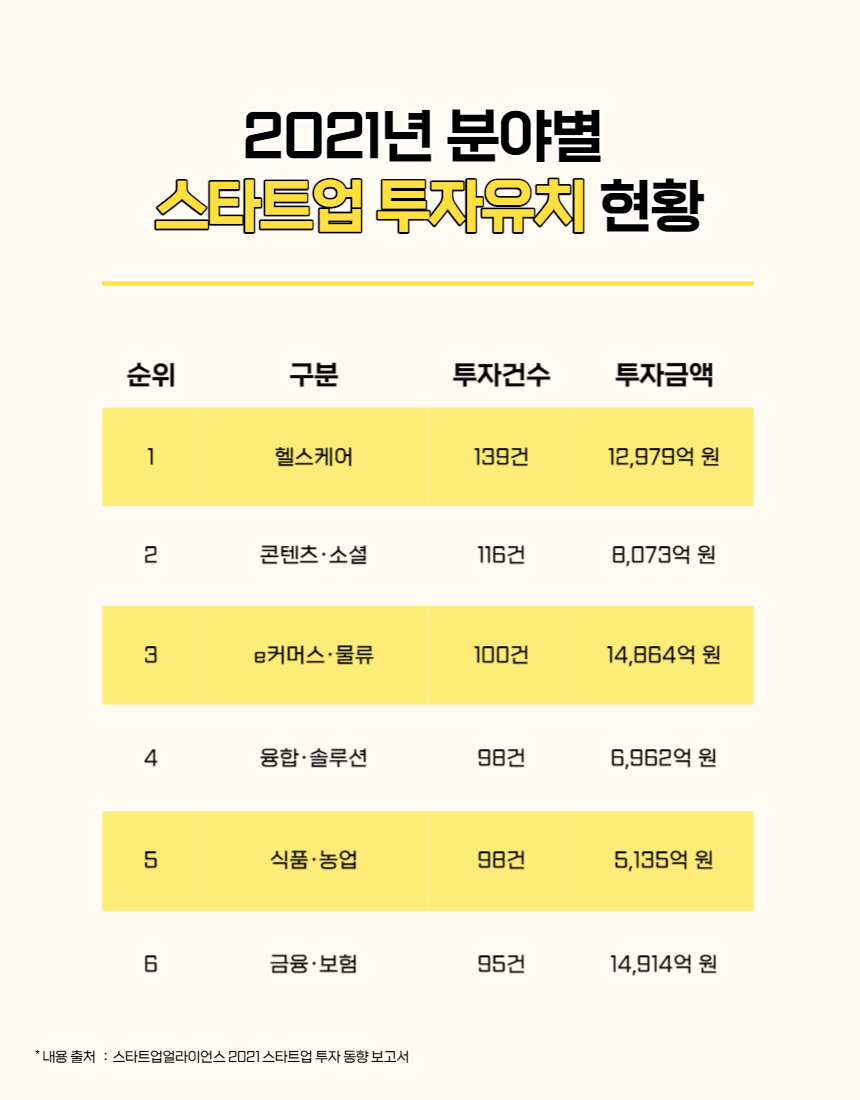 2021년 주요분야별 스타트업 투자유치 순위