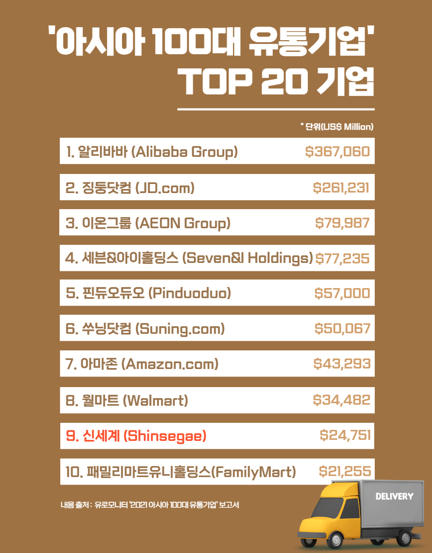 글로벌 시장조사기업 유로모니터 인터내셔널이 발표한 '2021 아시아 100대 유통기업' 보고서에 따르면 지난해 소매판매액을 기준으로 산정한 아시아 100대 유통기업 순위에서 한국 기업으로는 신세계(247억5100만 달러)가 9위를 차지해 국내 기업으로는 유일하게 10위 안에 이름을 올렸습니다.