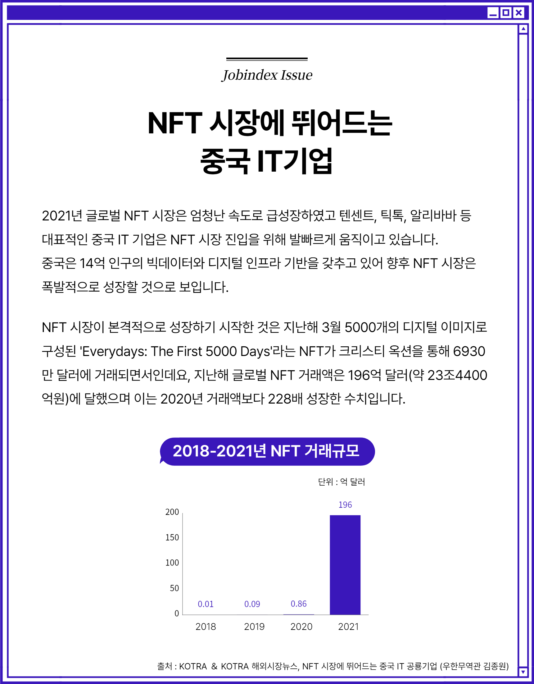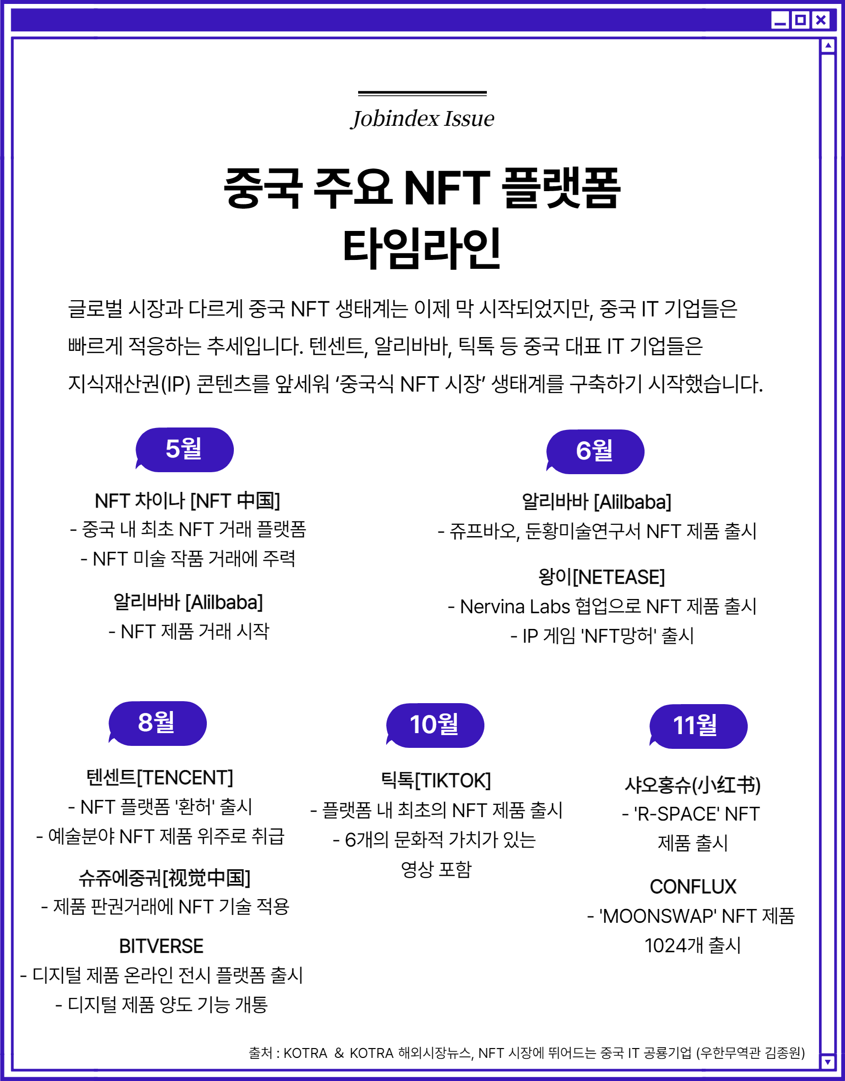 2021년 글로벌 NFT 시장이 엄청난 속도로 급성장한 가운데 중국 IT기업들은 빠르게 적응하며 지식재산권(IP) 콘텐츠를 앞세워 '중국식 NFT 시장' 생태계를 구축하고 있습니다.