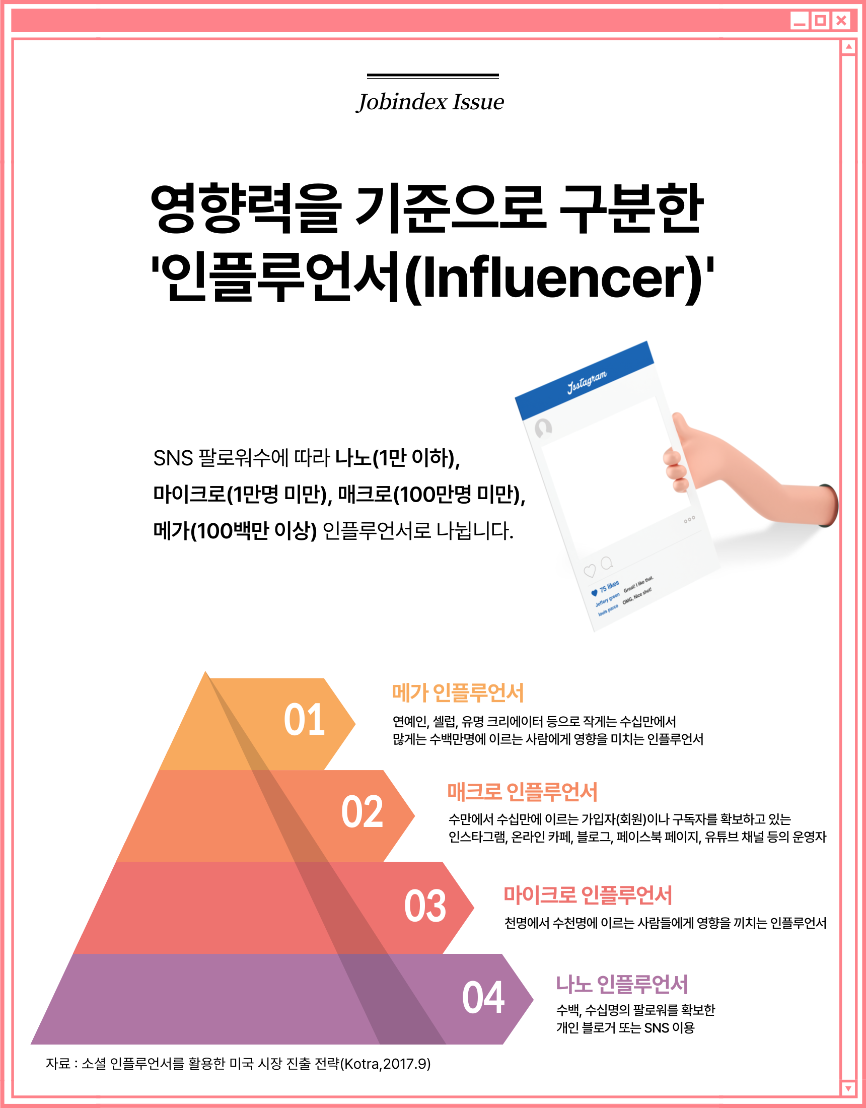그래서 오늘 첫번째로 준비한 주제는 요즘 대세로 떠오르고 있는 인플루언서 마케팅은 무엇이며, 글로벌 인플루언서 마케팅 시장규모, 그리고 영향력을 기준으로 구분한 인플루언서 유형까지! 알려드리려고 합니다:)
